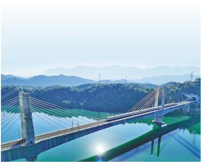 试运行列车驶过杭衢高铁新安江特大桥。