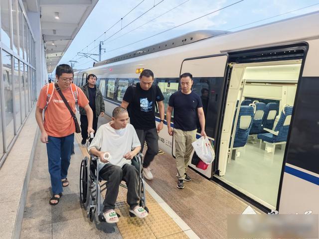 护送方某(左二)乘动车回乡