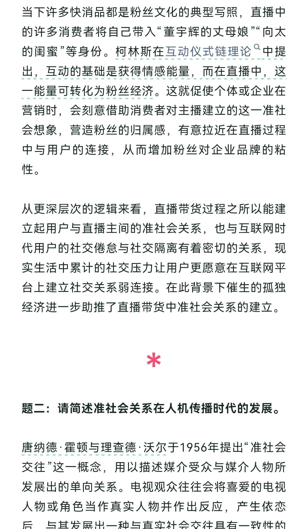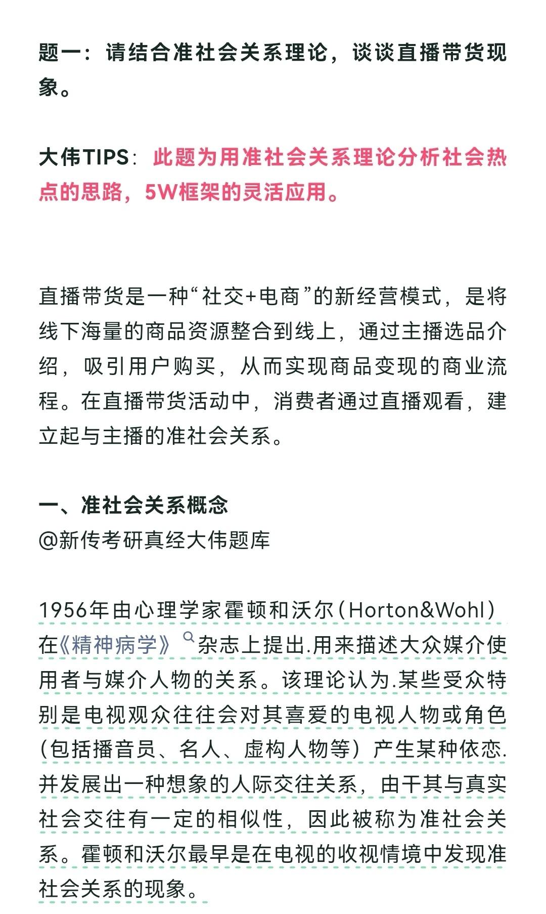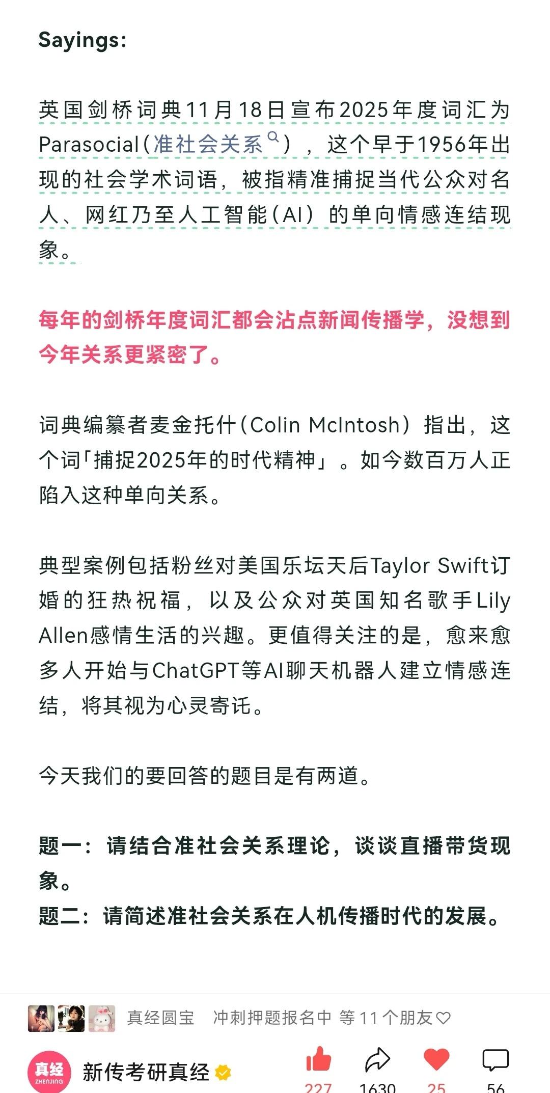剑桥年度词汇来了!这两道题显得十分重要了 英国剑桥词典11月18日宣布2025年度词汇为Parasocial(准社会关系),这个早于1956年出现的社会学术词语,被指精准捕捉当代公众对名人、网红乃至人工智能(AI)的单向情感连结现象。 每年的剑桥年度词汇都会沾点新闻传播学,没想到今年关系更紧密了。 词典编纂者麦金托什(Colin McIntosh)指出,这个词「捕捉2025年的时代精神」。如今数百万人正陷入这种单向关系。 典型案例包括粉丝对美国乐坛天后Taylor Swift订婚的狂热祝福,以及公众对英国知名歌手Lily Allen感情生活的兴趣。更值得关注的是,愈来愈多人开始与ChatGPT等AI聊天机器人建立情感连结,将其视为心灵寄讬。 今天我们一起掌握两个关于这个热点的题目~ 题一:请结合准社会关系理论,谈谈直播带货现象。 大伟TIPS:此题为用准社会关系理论分析社会热点的思路,5W框架的灵活应用。 【答题思路】 一、准社会关系概念 二、准社会关系视间下的直播带货 (一)消费者层面:观看直播,满足人际关系效用 (二)技术层面:平台赋能,提供关系建立支持 (三)直播主层面:粉丝文化,助推关系建立动因 题二:请简述准社会关系在人机传播时代的发展。 一、人机传播时代准社会关系的建构过程 (一)吸引阶段:功能作为吸引线索的前置性条件 (二)强化互动阶段:情感卷入与人格化特质深化 (三)场景塑造阶段:工具功能与聊天功能的融合 二、人机传播时代准社会关系的新特征 (一)虚拟空间中的“在场感”与多元角色扮演 (二)从单向度交往到实时互动的动态转变 三、人机传播中准社会关系的新挑战 (一)茧房效应与“乌合之众”危机 (二)人际交往疏离与技术依赖反噬 新传 新传考研真经 新传考研