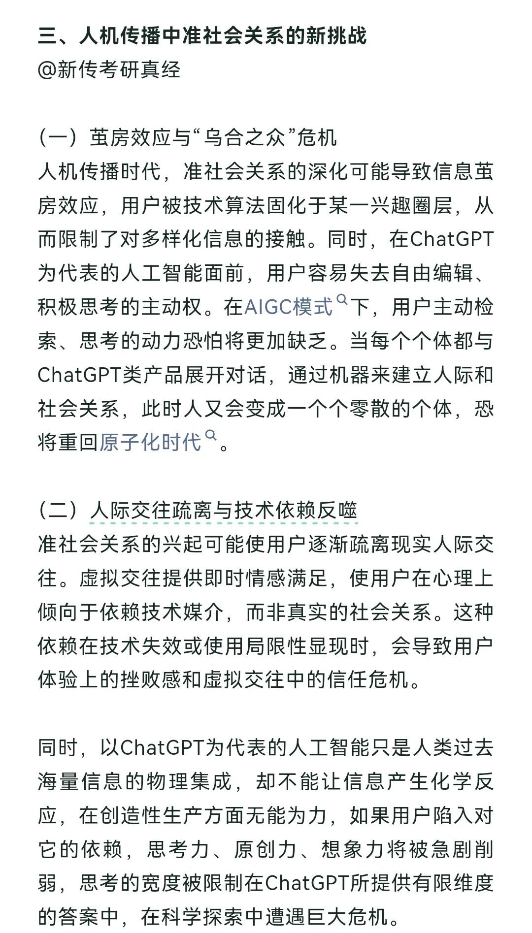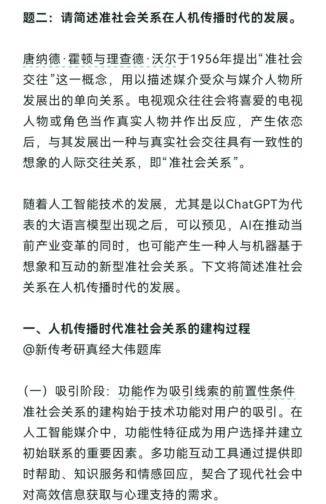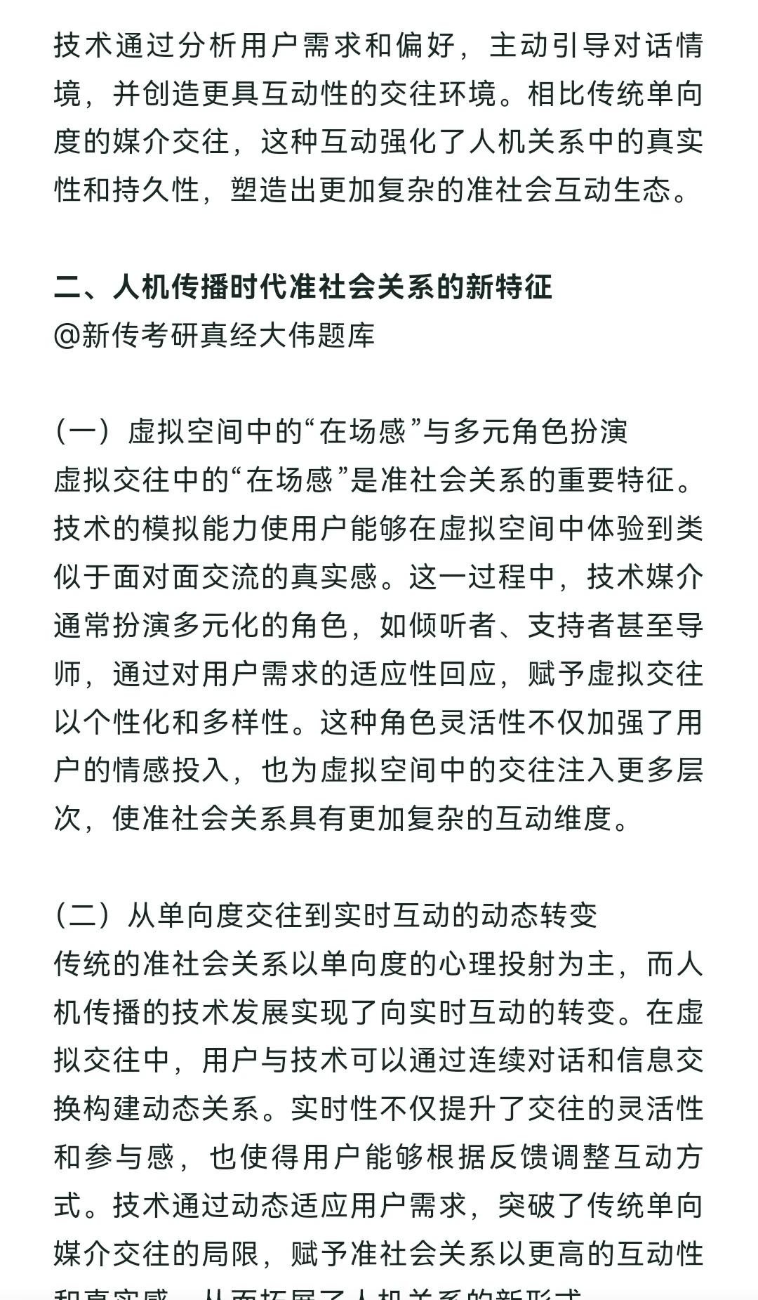剑桥年度词汇来了!这两道题显得十分重要了 英国剑桥词典11月18日宣布2025年度词汇为Parasocial(准社会关系),这个早于1956年出现的社会学术词语,被指精准捕捉当代公众对名人、网红乃至人工智能(AI)的单向情感连结现象。 每年的剑桥年度词汇都会沾点新闻传播学,没想到今年关系更紧密了。 词典编纂者麦金托什(Colin McIntosh)指出,这个词「捕捉2025年的时代精神」。如今数百万人正陷入这种单向关系。 典型案例包括粉丝对美国乐坛天后Taylor Swift订婚的狂热祝福,以及公众对英国知名歌手Lily Allen感情生活的兴趣。更值得关注的是,愈来愈多人开始与ChatGPT等AI聊天机器人建立情感连结,将其视为心灵寄讬。 今天我们一起掌握两个关于这个热点的题目~ 题一:请结合准社会关系理论,谈谈直播带货现象。 大伟TIPS:此题为用准社会关系理论分析社会热点的思路,5W框架的灵活应用。 【答题思路】 一、准社会关系概念 二、准社会关系视间下的直播带货 (一)消费者层面:观看直播,满足人际关系效用 (二)技术层面:平台赋能,提供关系建立支持 (三)直播主层面:粉丝文化,助推关系建立动因 题二:请简述准社会关系在人机传播时代的发展。 一、人机传播时代准社会关系的建构过程 (一)吸引阶段:功能作为吸引线索的前置性条件 (二)强化互动阶段:情感卷入与人格化特质深化 (三)场景塑造阶段:工具功能与聊天功能的融合 二、人机传播时代准社会关系的新特征 (一)虚拟空间中的“在场感”与多元角色扮演 (二)从单向度交往到实时互动的动态转变 三、人机传播中准社会关系的新挑战 (一)茧房效应与“乌合之众”危机 (二)人际交往疏离与技术依赖反噬 新传 新传考研真经 新传考研