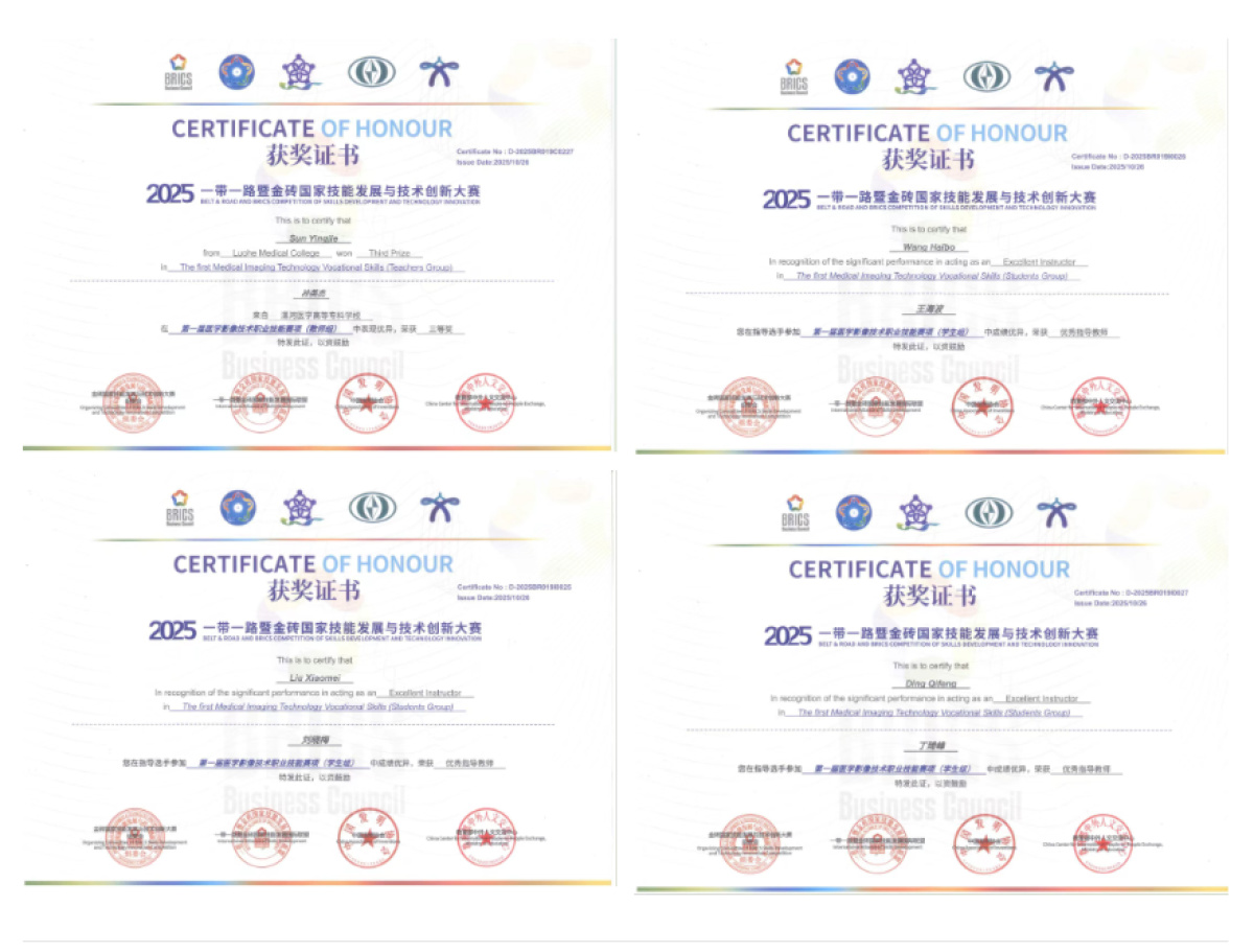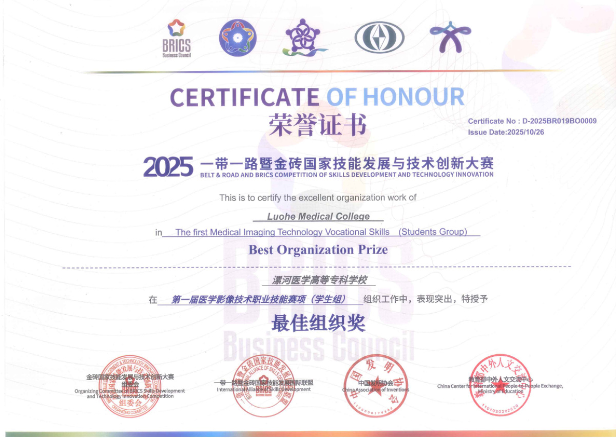 10月23日至26日,2025“一带一路”暨金砖国家技能发展与技术创新大赛——医学影像技术职业技能赛项在北京卫生职业学院圆满举行。漯河医专二附院医学影像团队在周山主任的带领下,与来自全国61所职业院校的优秀师生同台竞技。师生团队奋勇争先、发挥出色,在学生实践技能比赛及教师教学相关赛项中均斩获优异奖项。