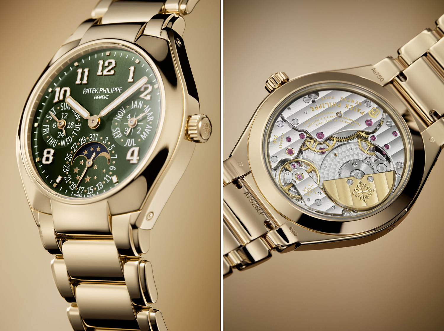 全手工抛光玫瑰金表壳沿用36毫米直径,提供两款表盘选择:一款配备银表盘(Ref.7340/1R-001),采用水平和垂直缎纹磨砂处理,呈现重磅丝绸般的饰面效果;另一款配备橄榄绿色日辉纹表盘(Ref.7340/1R-010)。玫瑰金表链同样采用全抛光处理,搭配专利折叠式表扣,以四枚独立锁扣固定,令佩戴舒适牢固。