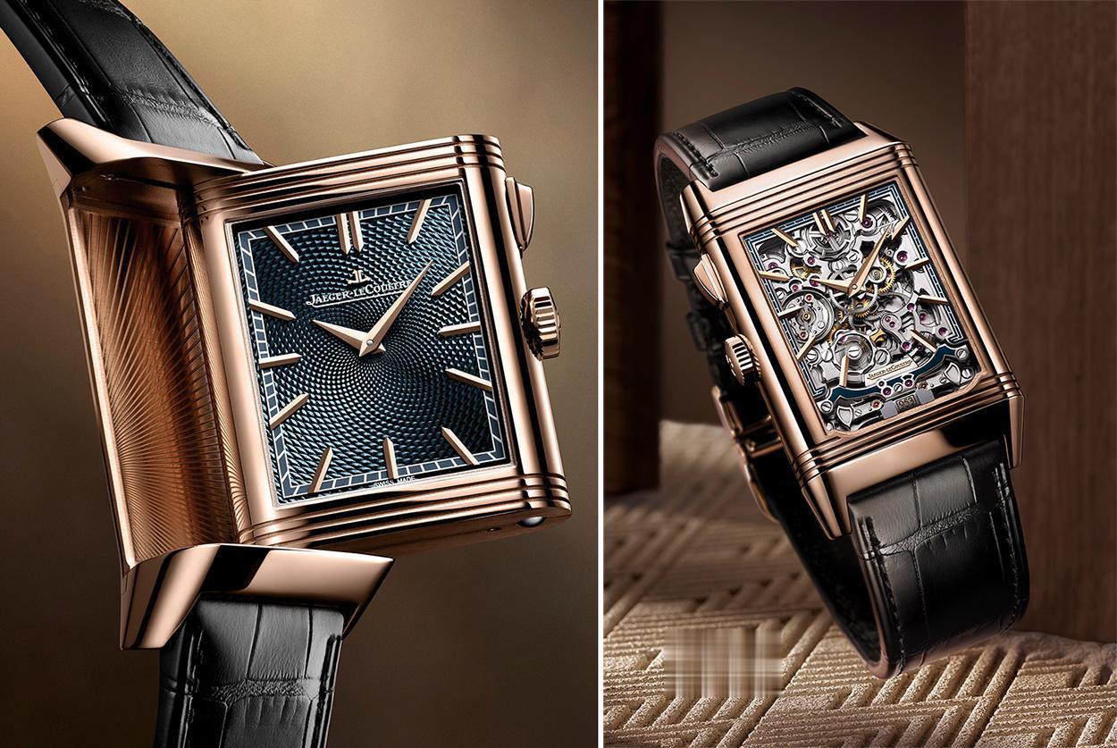 全新ReversoTributeMinuteRepeater翻转系列三问报时腕表限量30枚,玫瑰金表壳搭配黑色鳄鱼皮表带