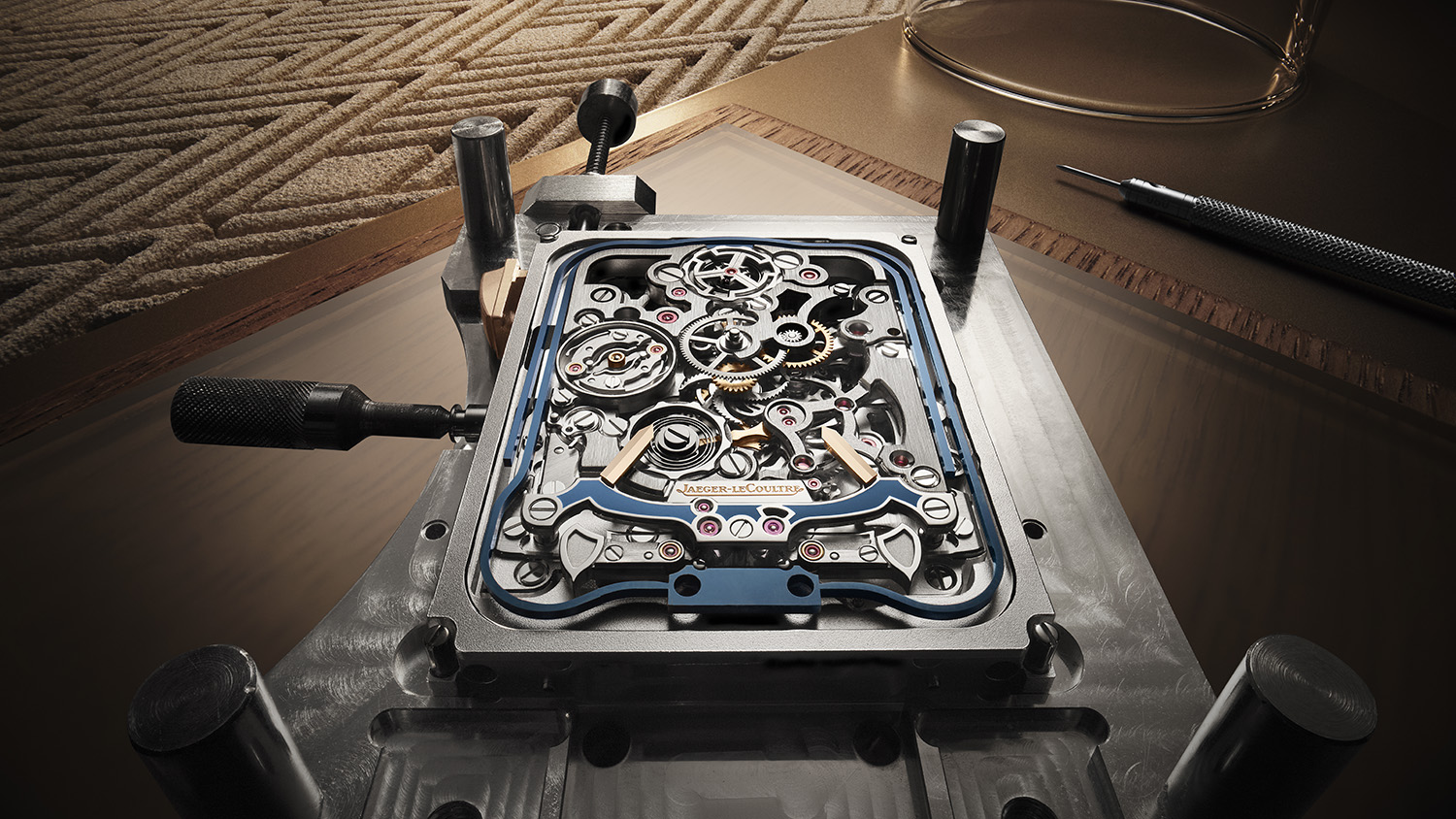 虽然大部分的三问报时和万年历的机械装置设于表盘下方,但构建鸣响装置至关重要的部件——构成机芯框架的两个手工弯曲音簧和两个音槌仍清晰可见。其中音槌经过黑色抛光精细处理,这项精湛的技术能令入射光线仅向单一方向折射,从特定角度观察,表面显现为亮黑色,其他角度则呈现镜面般的光泽。此外,离心调节器嵌于悬空位置,运作时几乎静寂无声,并在鸣响装置运行时以每分钟超过2,000转的速度旋转,确保敲击的节奏一致。