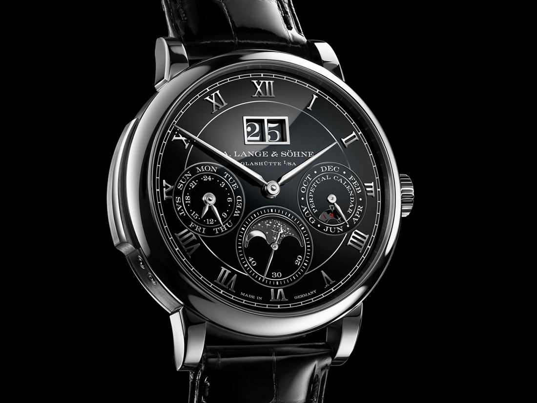 新作配备朗格表厂自制黑色珐琅表盘,搭配四个精致的珐琅盘面,包括12时位置的标志性朗格大日历显示,以及6时位置配备小秒针和月相显示,后者以750金制作的月亮图案周围饰以100多颗手工雕刻的星形图案。该铂金950款腕表表壳直径为40.5毫米,厚度为12.1毫米,限量发行50枚。