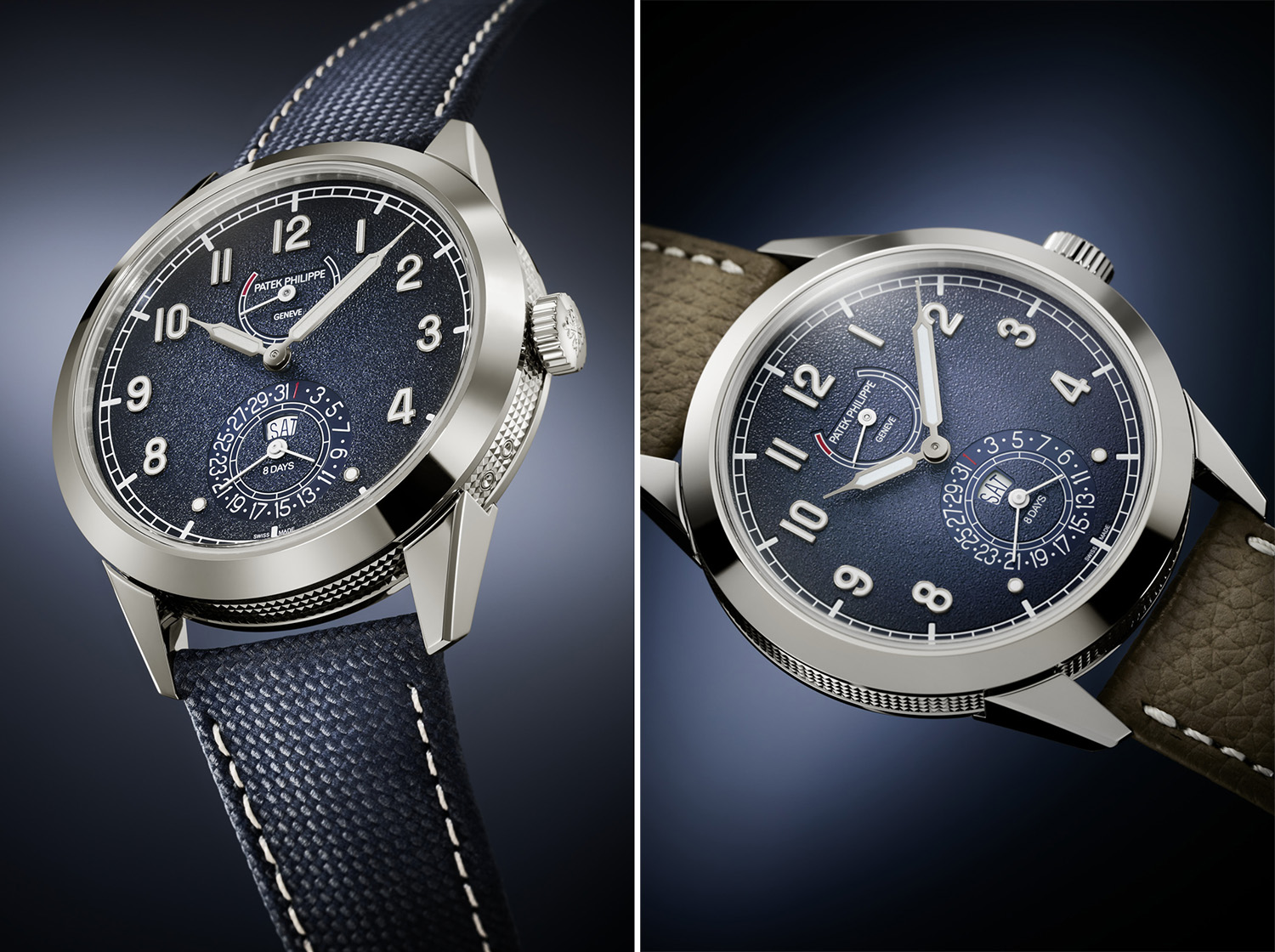 该新作采用41毫米直径的白金表壳,其边缘雕饰百达翡丽标志性的巴黎钉纹;搭配的蓝色纹理表盘采用新颖的纵轴显示布局,边缘呈黑色渐变效果,并饰有白金立体字块、时针及分针。这款腕表配备两款表带,搭配新款专利三折叠式表扣:一款为蓝色小牛皮纹理图案表带,饰乳白色缝线(原配表带);另一款为灰褐色粒面小牛皮表带(附赠表带)。