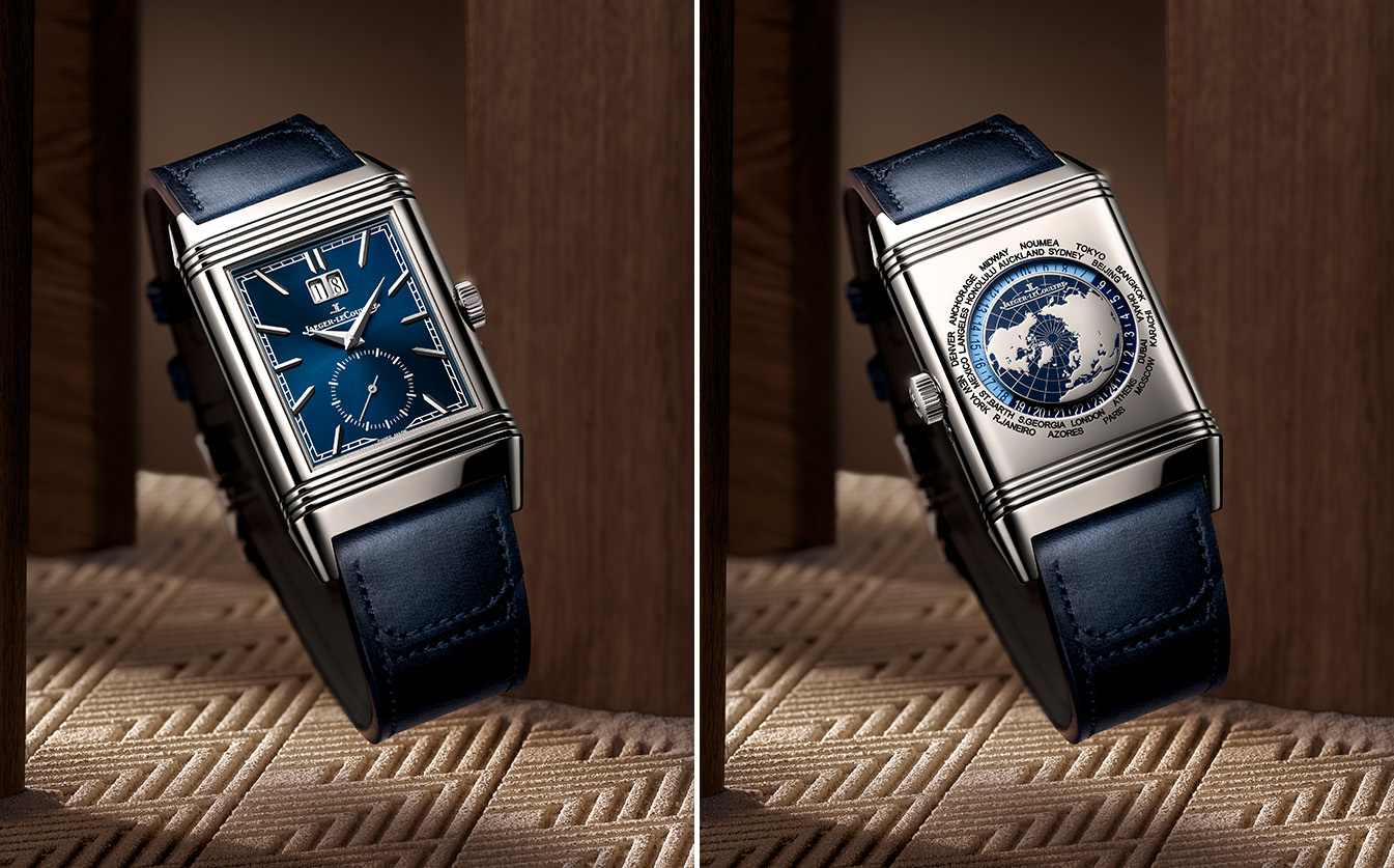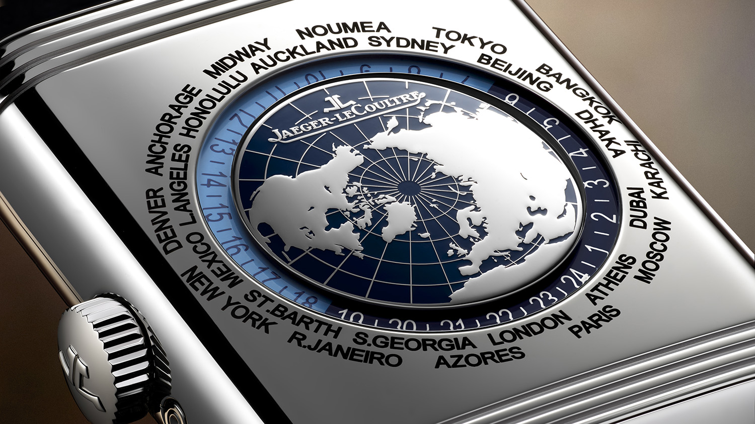 新款腕表将世界时显示置于背面表盘,该功能既方便读时,亦操作简便。表壳顶部设有一个隐藏式推杆,当将表壳移出表框时才会显露,方便轻松调校——轻按动一次触碰式按钮,就能以1小时为单位调校时间。新作备有精钢或18K玫瑰金表壳两种款式分别搭配深蓝色调、巧克力棕色调。地图转盘由积家大工坊自主制作,采用激光切割141个凹槽并经手工涂覆漆面,营造出微妙的三维立体效果;城市名称直接镌刻于表背,显示窗内的24小时旋转圆环指示昼夜,中央的世界地图标有经线刻度,为时区提供更直观的视觉参照。