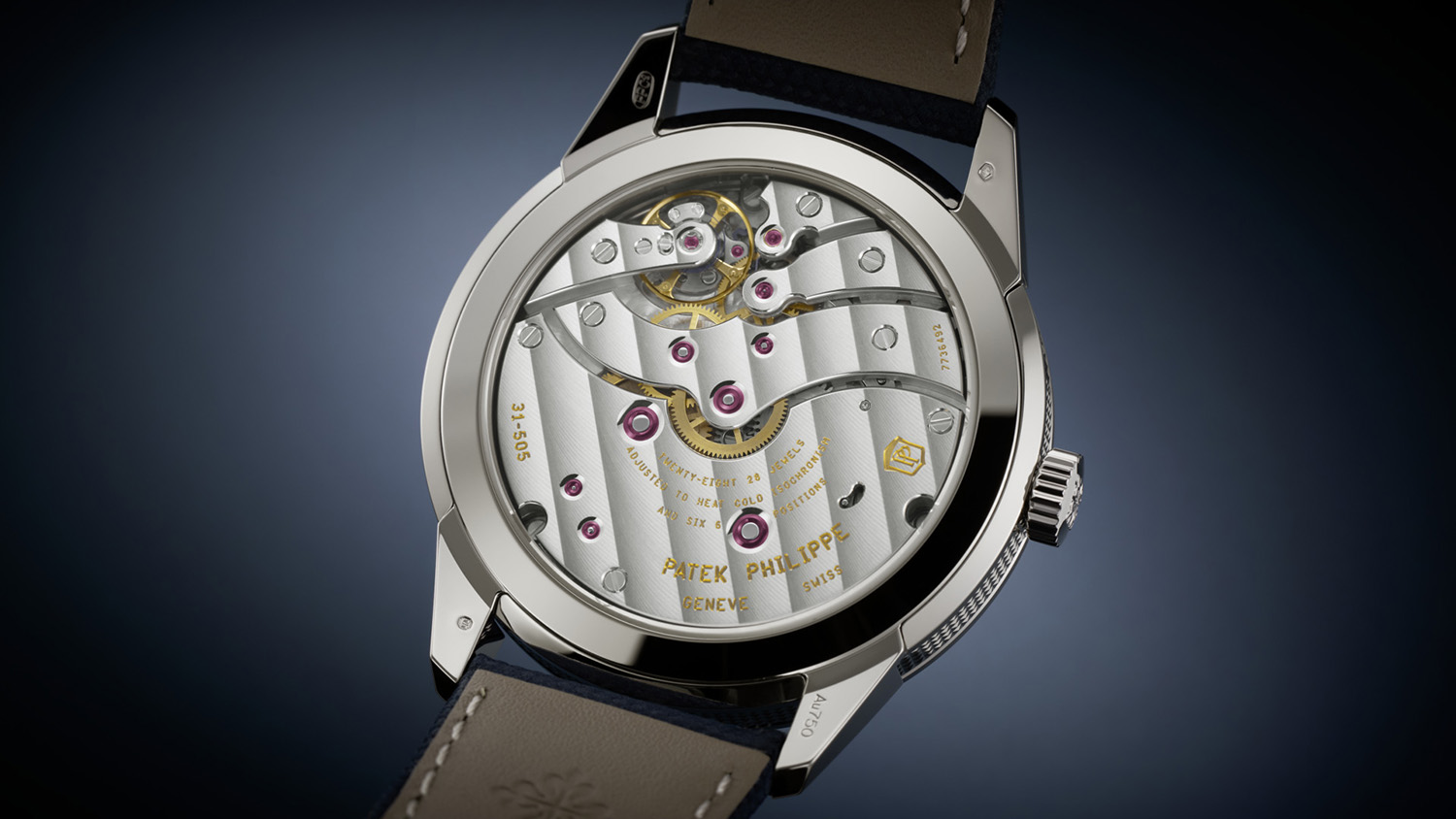 这款时计搭载全新31-5058JPSIRMCIJ手动上弦机芯,历经五年研发。该机芯秉承传统结构,同时精妙融合多项创新技术与优化功能,尤其是由Silinvar材质擒纵轮和擒纵叉组成的Pulsomax擒纵装置,这是百达翡丽先进技术研究(PatekPhilippeAdvancedResearch)项目的一项重要成果。两个串联发条盒确保腕表精确运转长达八日,动力储存消耗至第九日时,位于12时位置的拱形动力储存显示将以红色标示提醒表主为机芯上弦。