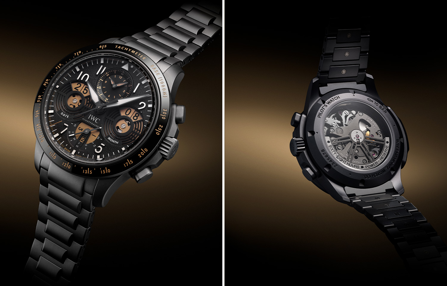 此外,IWC万国表还为飞行员系列新增首款搭载万年历显示的高性能计时腕表——高性能计时万年历数字日期月份腕表。整体全黑色的外观——表壳、按钮、表冠及表带均采用品牌自主研发的Ceratanium瓷化钛金属制作,搭配黑色锤纹表盘和黑色指针,并配备带有测速刻度的黑色陶瓷表圈。新作的亮点之一是万年历功能采用大型金色盘面数字日期显示,这一设计灵感源自品牌于十九世纪80年代推出的经典波威柏(Pallweber)怀表,这是史上首款以单数字盘显示小时和分钟的时计。腕表搭载IWC自制89802型机芯,提供68小时动力储备。由474个部件组成的高端机械机芯透过有色蓝宝石玻璃表背清晰可见,机芯同时驱动计时功能。