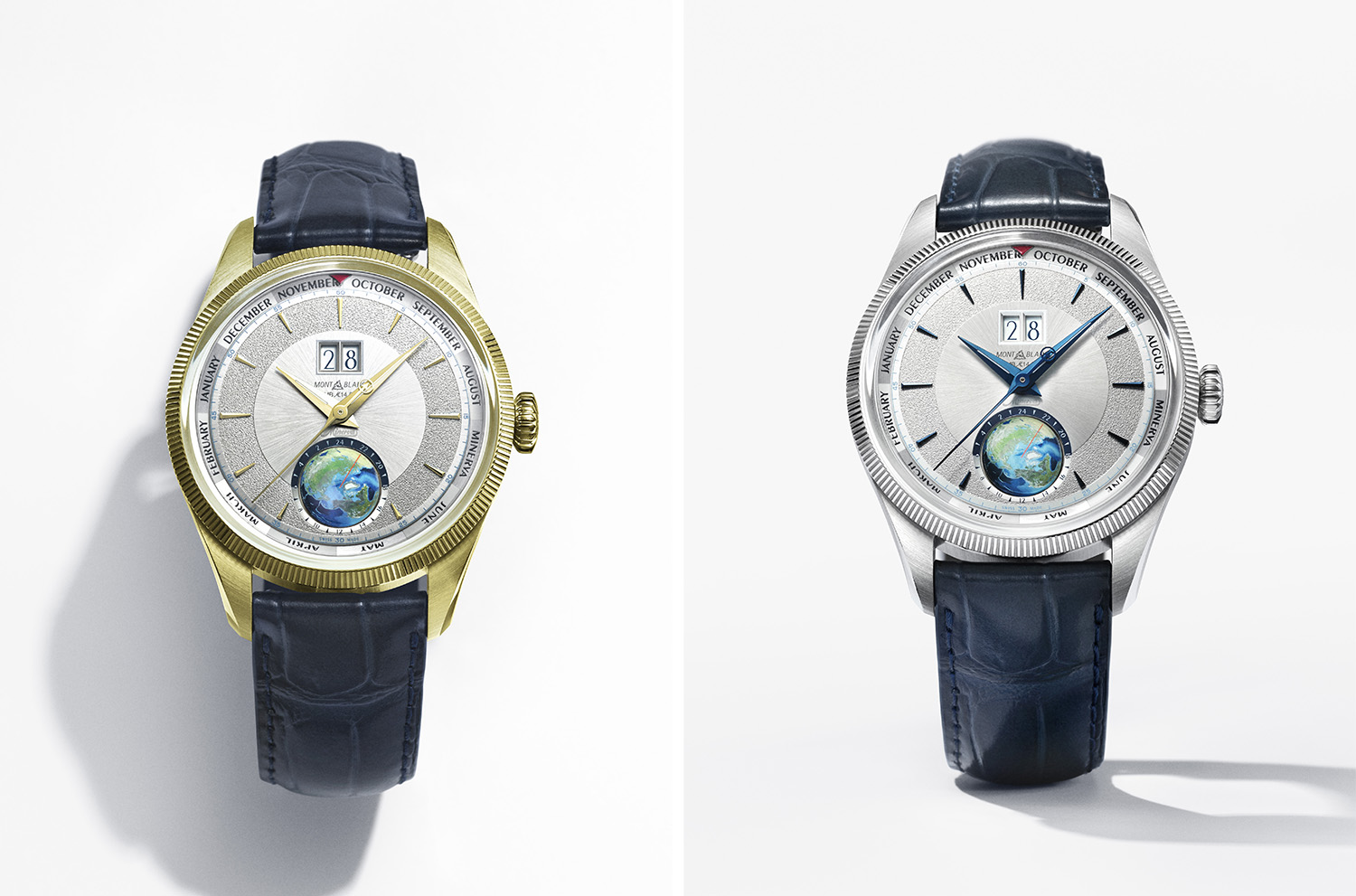 全新腕表的亮点之一在于表盘上手工绘制的旋转立体半球,以精湛工艺展现北半球的风貌,并巧妙融入了昼夜显示功能。半球之上饰以醒目的橙色子午线贯穿南北,24小时刻度圈环绕其周。新作亦配备美耐华时计标志性的坑纹表圈。其中,全球30枚表款以18K青柠金固定坑纹表圈,搭配18K青柠金缎面抛光饰面表壳,全球100枚表款则以18K白金固定坑纹表圈,搭配缎面抛光饰面精钢表壳。两款全新腕表均采用42毫米表壳。表盘炫目的金属光泽与细腻的太阳放射纹交织,搭配粒纹时标圈。