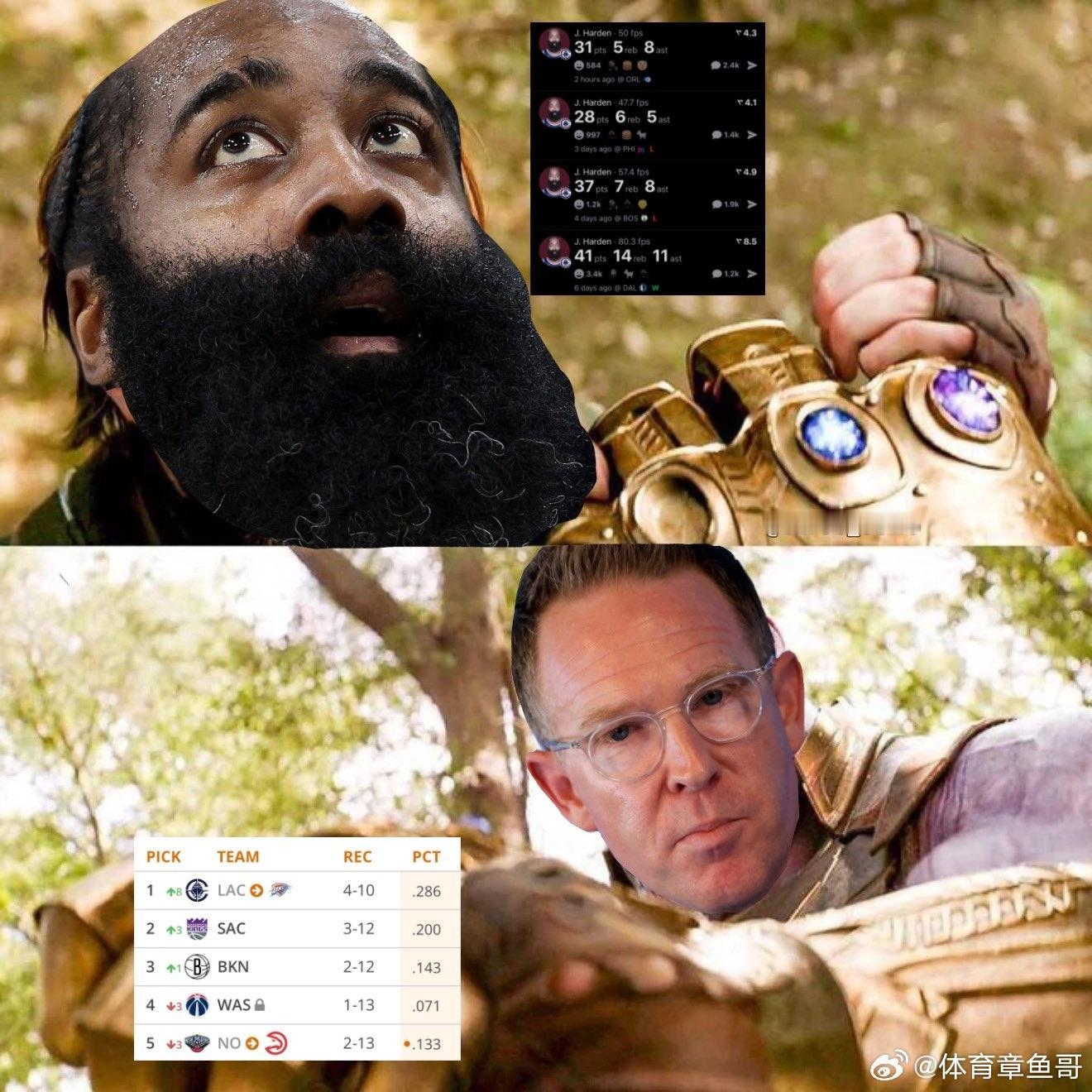船沉了,只有哈登没裸泳……詹姆斯哈登和洛杉矶快船队最近10场比赛输掉了9场,他们本赛季的战绩是4胜11负!