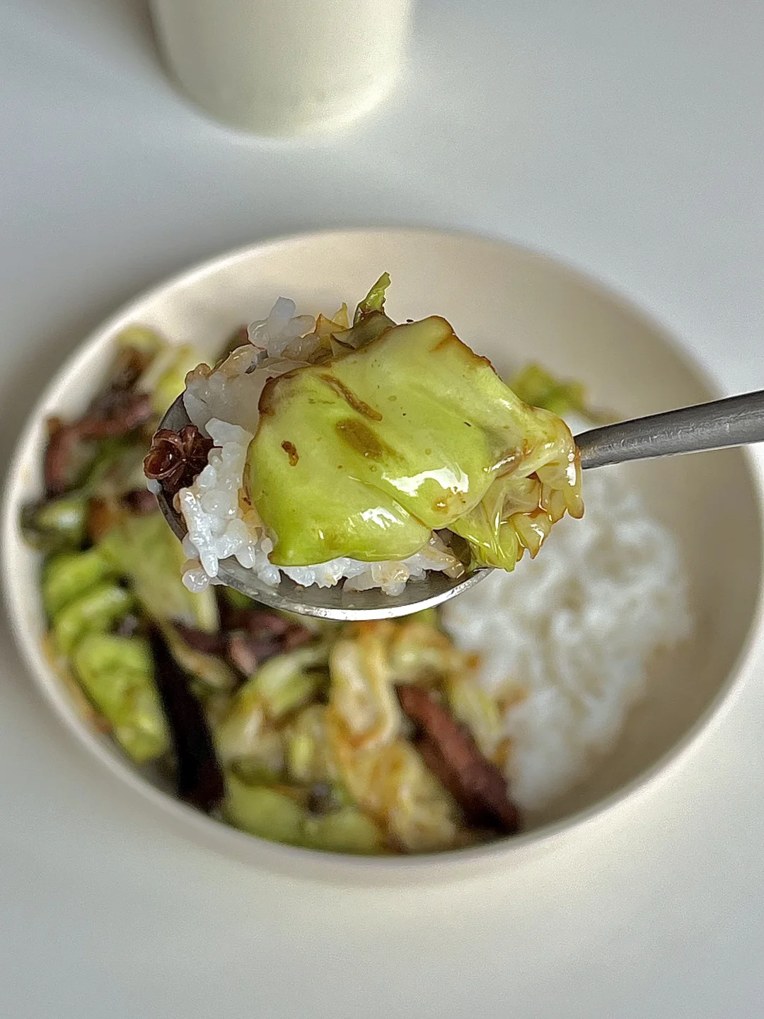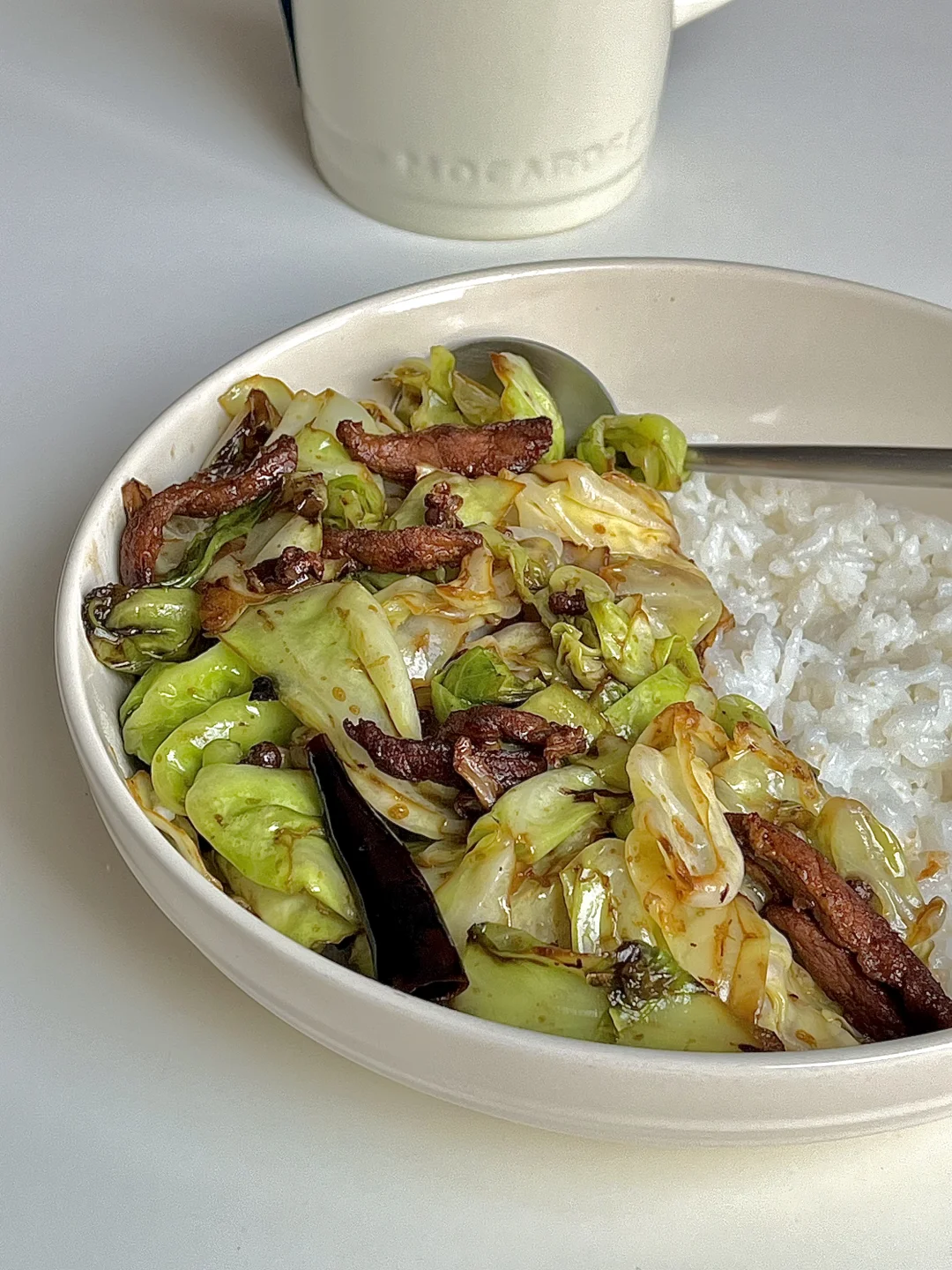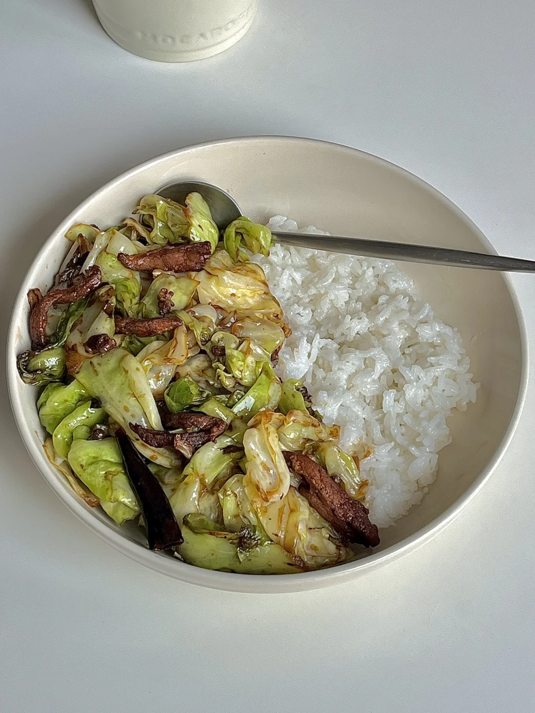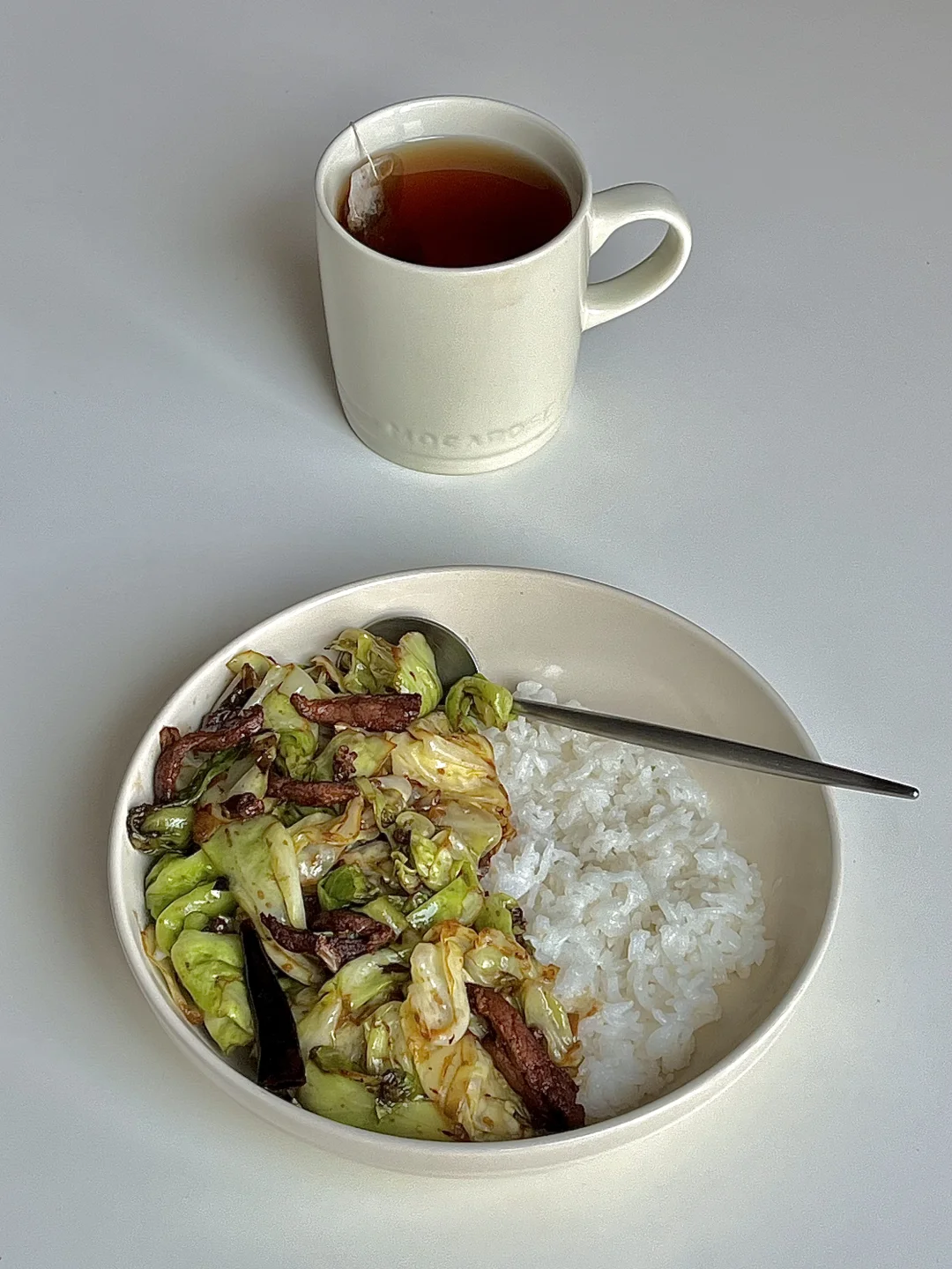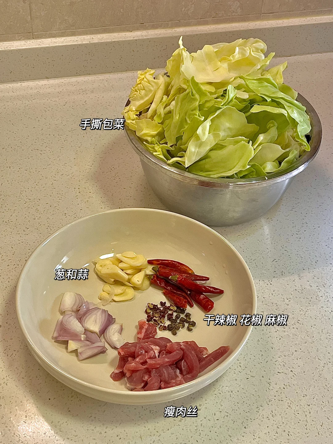 今日份一人食健康餐分享: 水撕包菜 白米饭🍚 一杯红茶☕️ . 食材:包菜 干辣椒 花椒 麻椒 葱和蒜 做法如图上⬆️ . 麻辣的水撕包菜,真香😋