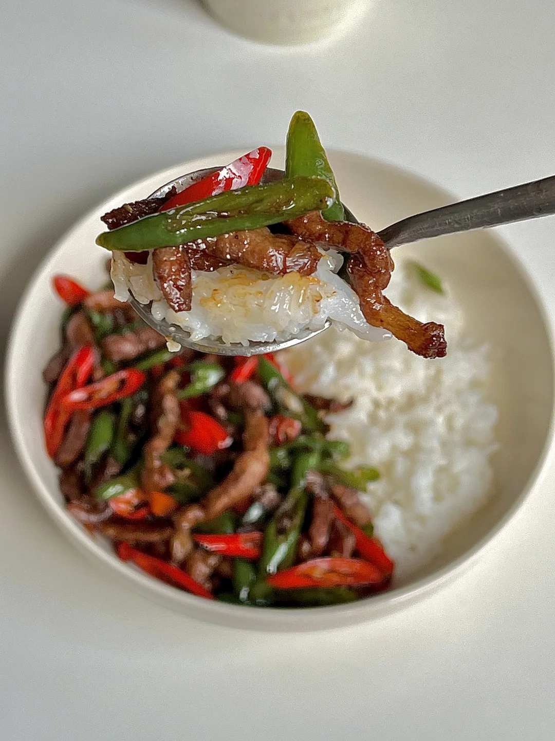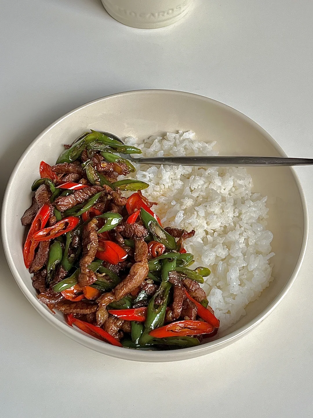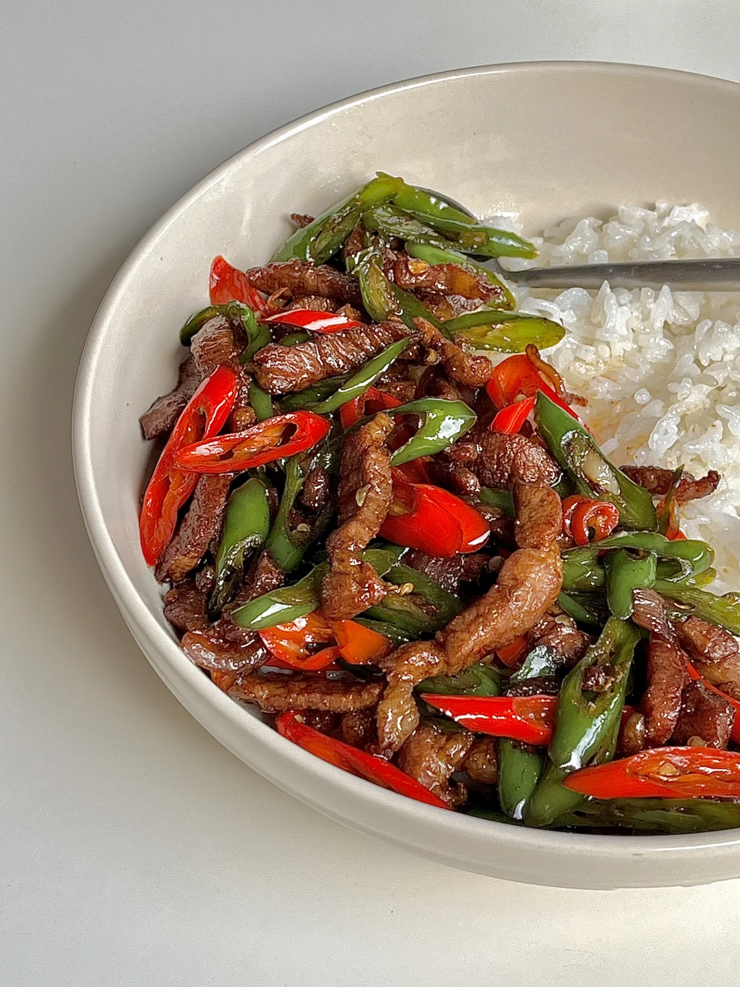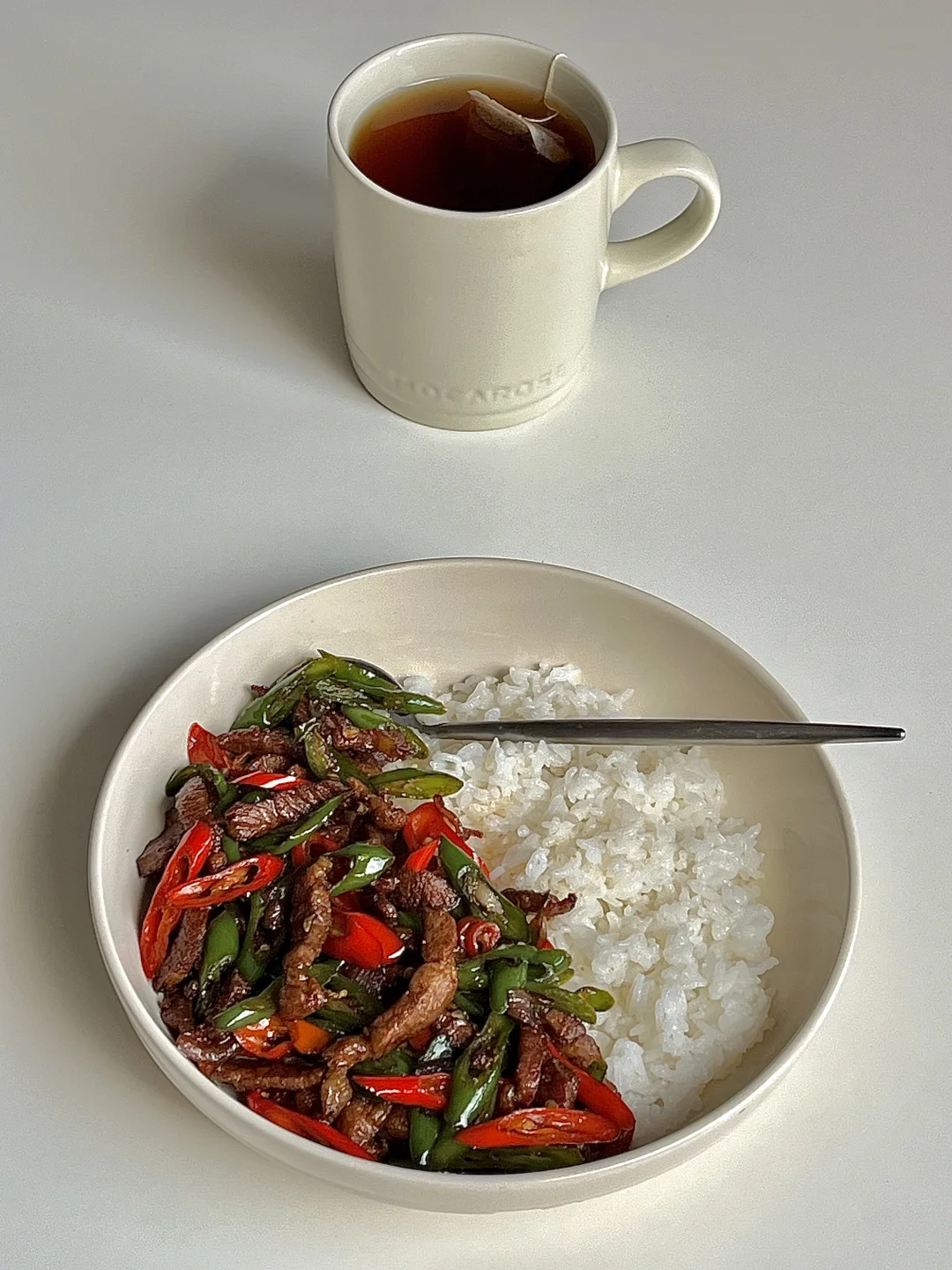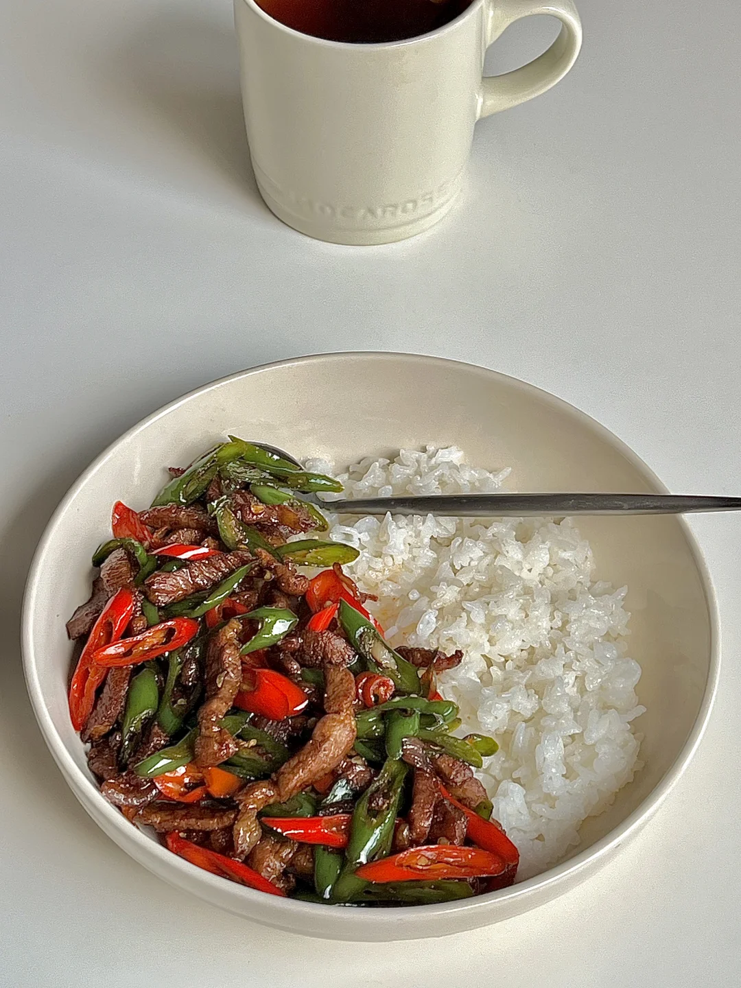 今日份一人食健康午餐分享: 双椒炒肉 白米饭🍚 一杯红茶☕️ . 食材:青红辣椒(用线椒)梅花肉 葱花蒜片 做法如图上⬆️ . 一定要用线椒,炒出来巨好吃,这也太下饭太辣了😋