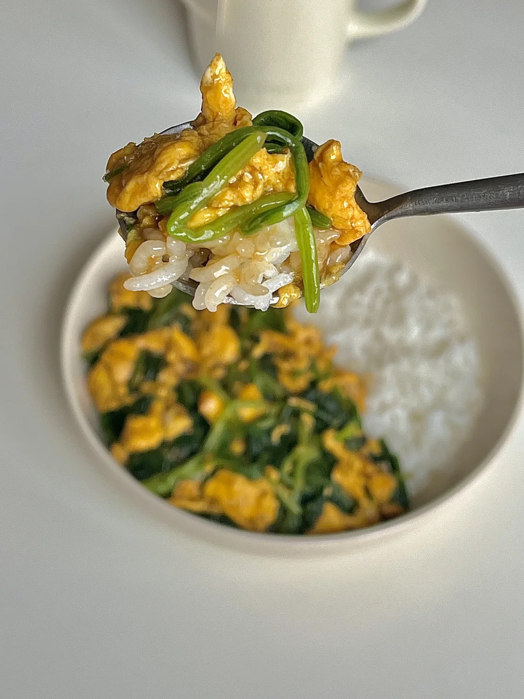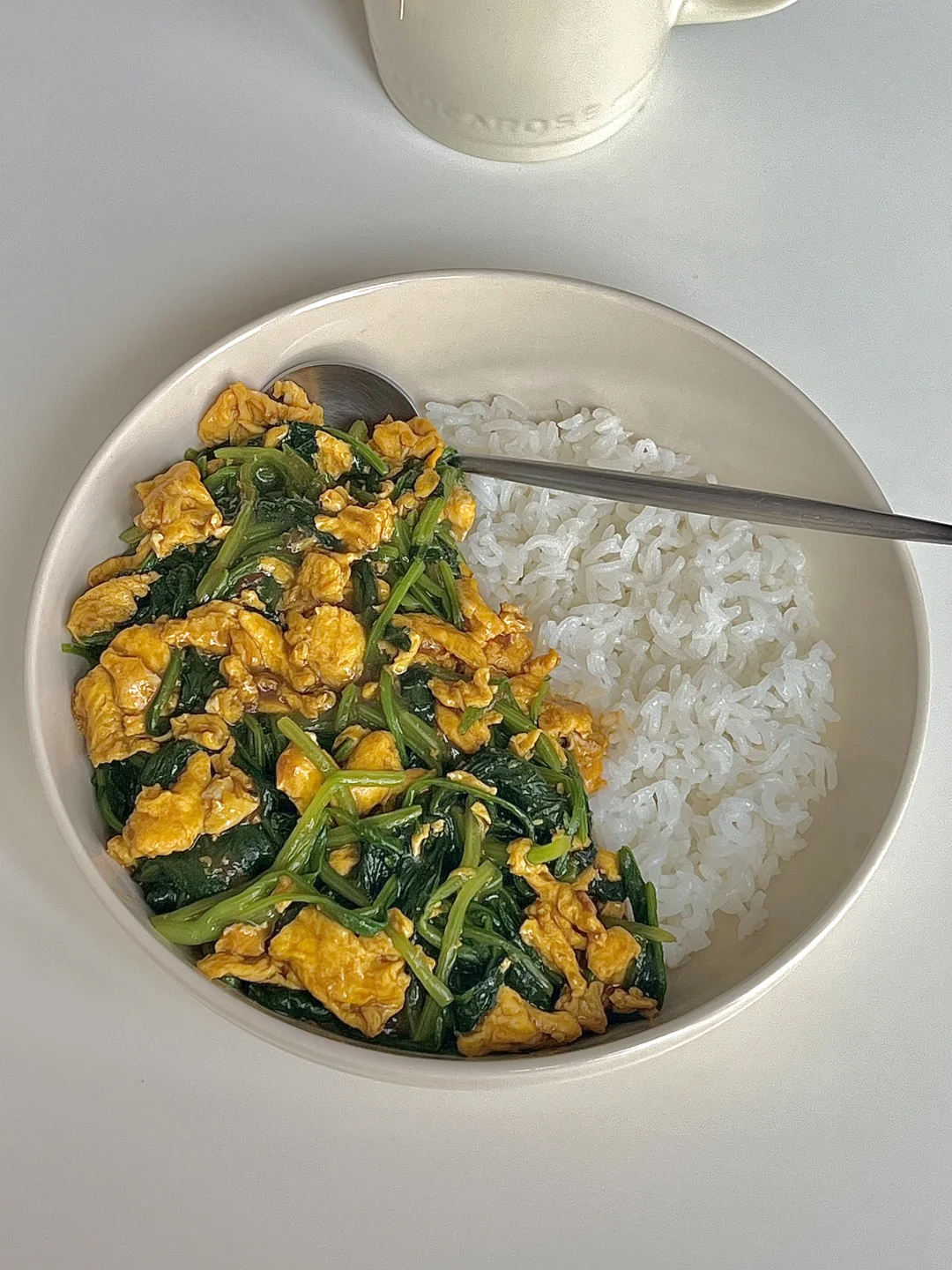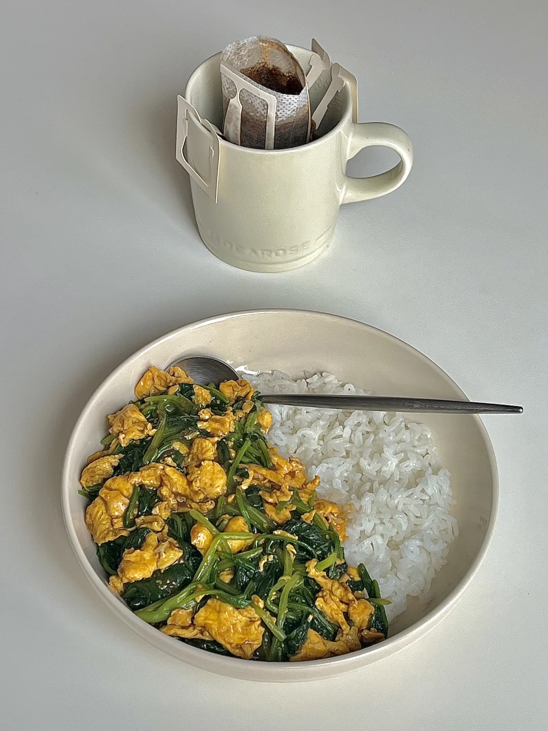 今日份一人食健康午餐分享: 菠菜炒鸡蛋 白米饭🍚 一杯挂耳咖啡, . 食材:菠菜 鸡蛋 做法如图上⬆️ . 第一次吃这样炒的菠菜鸡蛋 味道很浓郁 下饭好吃还健康😋