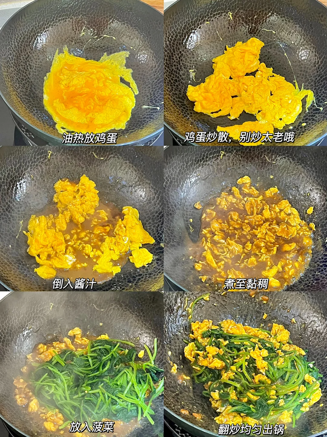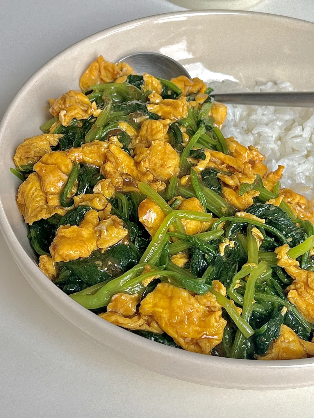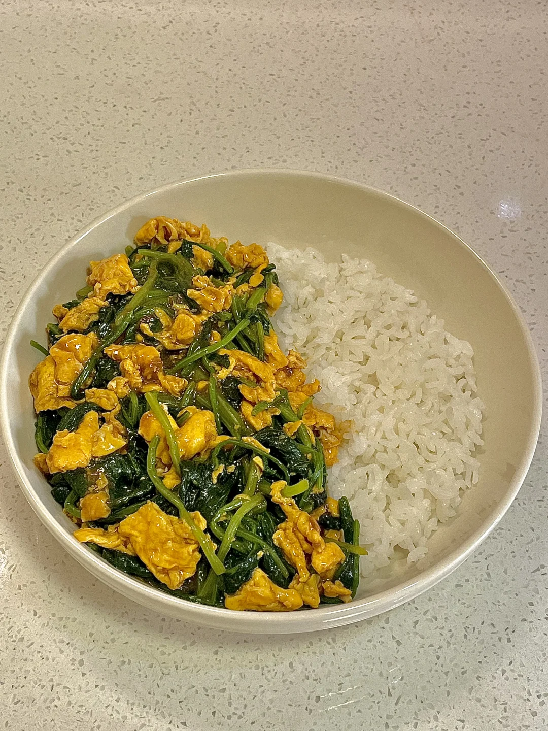今日份一人食健康午餐分享: 菠菜炒鸡蛋 白米饭🍚 一杯挂耳咖啡, . 食材:菠菜 鸡蛋 做法如图上⬆️ . 第一次吃这样炒的菠菜鸡蛋 味道很浓郁 下饭好吃还健康😋