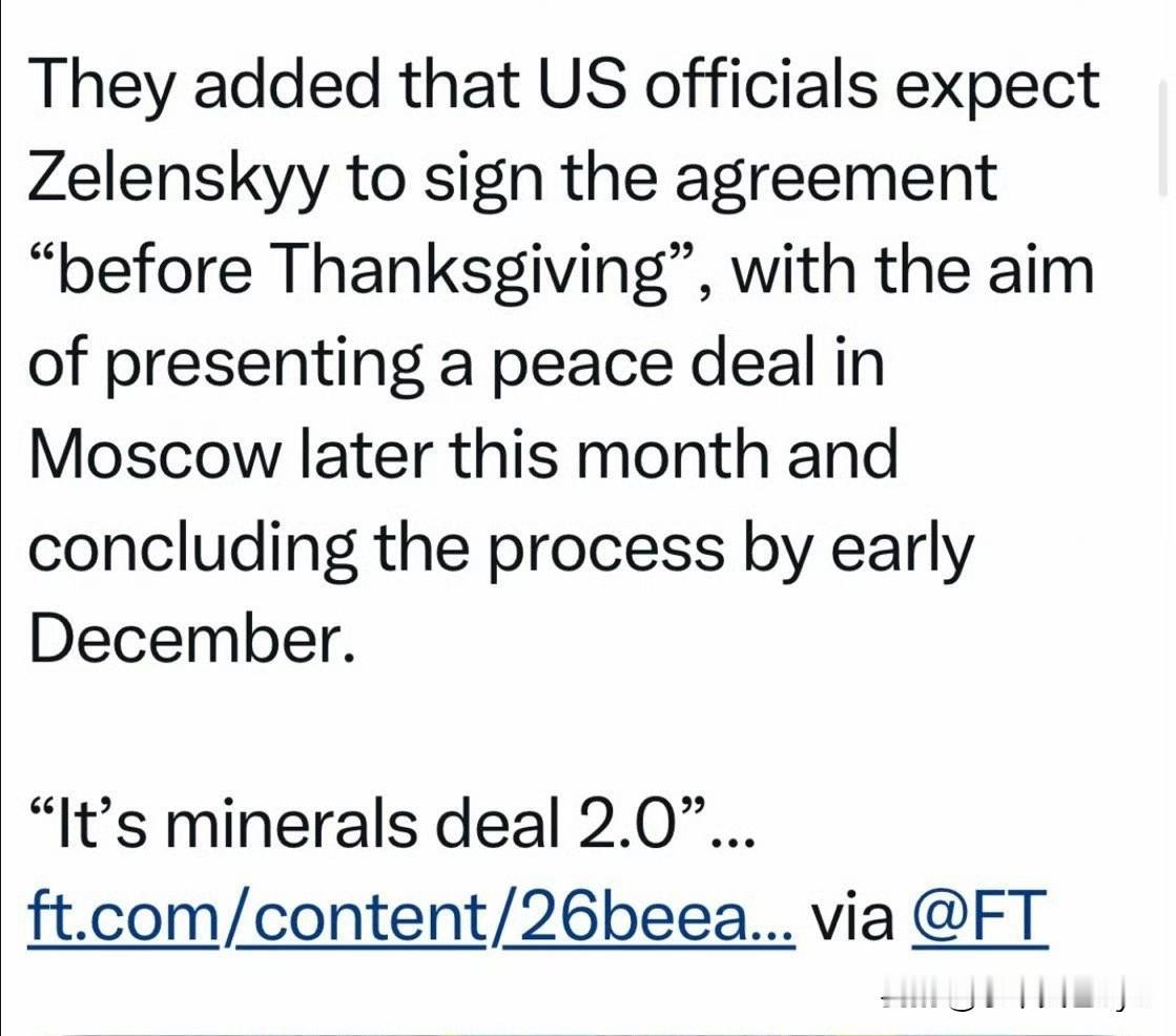 《金融时报》援引乌克兰官员:美国正施加巨大压力,逼迫乌克兰接受最新版“和平方案” 白宫希望泽连斯基在“感恩节(27日)前签字”,以便十一月底能交给俄,然后十二月初达成协议,实现“年内停战”的目标 。 综合近日多家外媒报道,美国特朗普政府确实正积极推动这项关于俄乌冲突的新和平计划,并对乌克兰施加压力,希望尽快取得进展。 当前各相关方立场与反应 - 乌克兰:认为方案等同于"投降"和"羞辱",触及多重红线;但面临前线与国内政治双重压力 。 美国:官方确认计划存在并表示"乐观",称其是旨在结束战争的"务实"方案 。 俄罗斯:克里姆林宫支持这一方案,但目前俄美之间并未就新的解决方案进行磋商 。 欧洲:担忧被边缘化;强调任何方案都需乌克兰和欧洲的支持,反对"投降式和平"。 该和平计划目前更像一个初步框架,成功与否取决于多方因素。鉴于其内容严重偏向俄罗斯,并触及乌克兰的主权红线,在未经重大修改的情况下被乌克兰接受的可能性极低。最终是促成谈判重启,还是进一步加剧僵局,尚待观察。