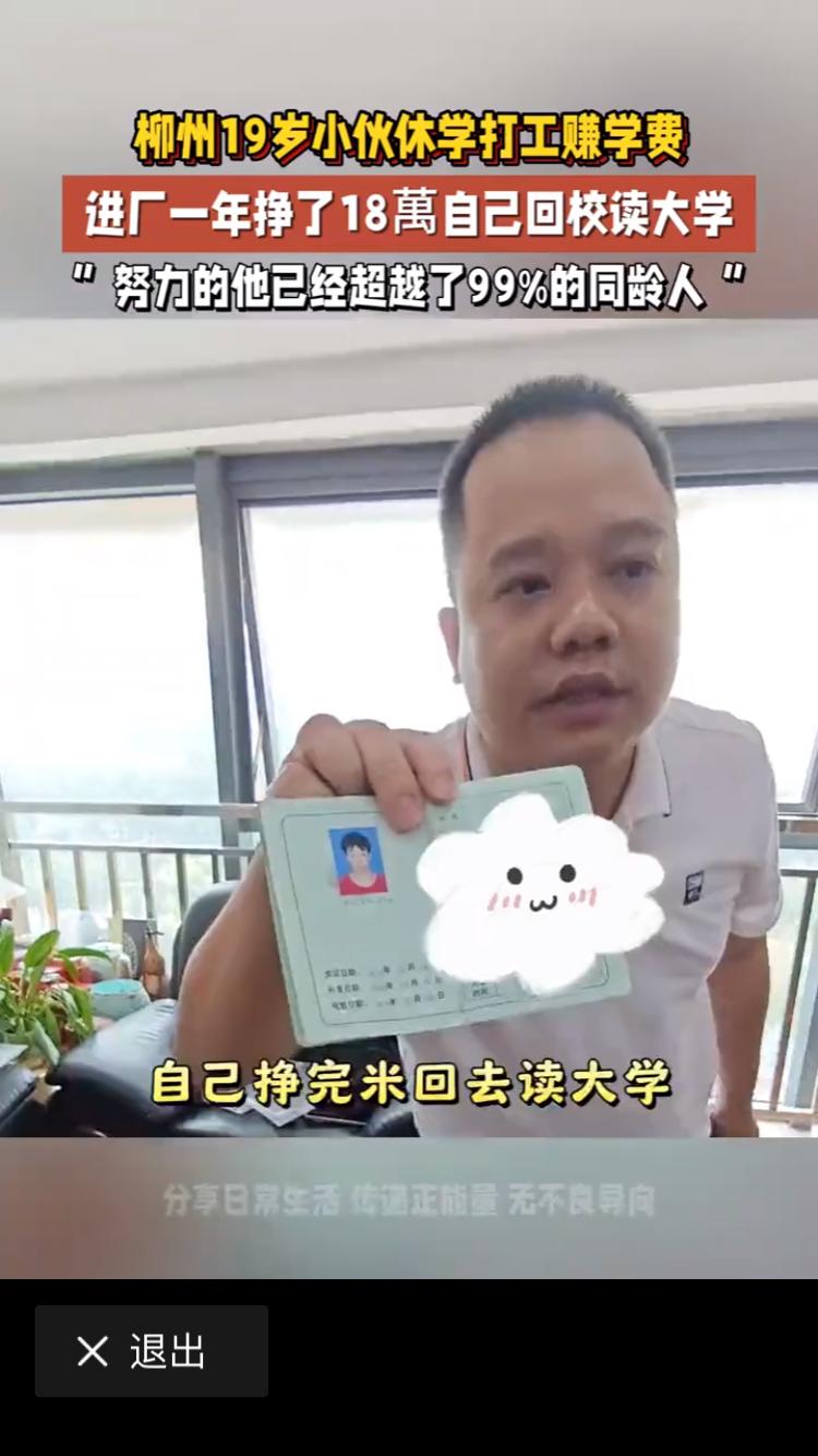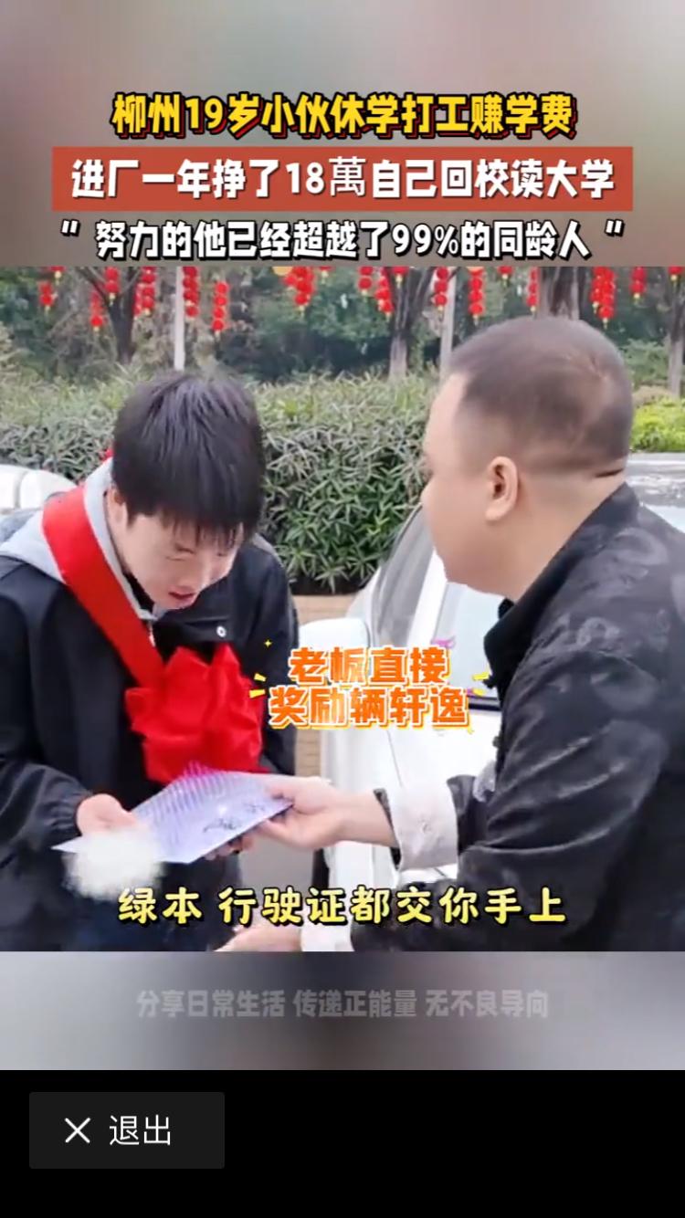 分享一个正能量的事,19岁柳州小伙打工赚学费,一年赚到18万多再回去上大学。 老板非常感动,不止送了一辆车,还给了奖励。老板还专门拍视频记录了这激动人心温暖人间的事情。 鼓励所有艰苦奋斗的年轻人,人间自由温情在。
