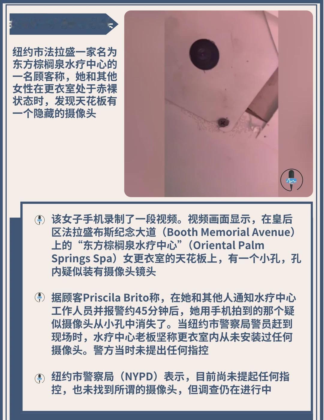 🚨法拉盛水疗中心疑似“更衣室藏摄像头” 位于 Booth Memorial Avenue 的 Oriental Palm Springs Spa(东方棕榈泉水疗中心) 被一名女性顾客指控:女更衣室天花板疑似藏有摄像头。 👀 顾客称在更衣室赤裸时发现“可疑小孔” 一名女性顾客在更衣室准备护理、处于全身裸露状态时,意外抬头看到天花板有一个小孔,孔内疑似能看到类似摄像头镜头的装置。她立刻拿出手机录影📱,并表示该装置正对着护理台的位置,其他女性当时也在脱衣准备护理。其中一名女性说自己被吓得“震惊且深受影响”,这类意外真的很难不害怕…😰 😳 更诡异的是:报警前拍到、警察到时“消失了” 顾客 Priscila Brito 表示,她和其他人马上通知店家并报警。大约 45 分钟后,当警方赶到时,她先前拍到疑似摄像头的那个小孔内的装置却已经消失不见⚠️。 水疗中心老板面对警方时坚称:“从来没有装过任何摄像头。” 警方目前并未做出指控,也未在现场找到设备,但案件仍在调查中。 🎤 店主拒绝回应 随后有人到店询问关于小孔内是否装置设备的情况。 店主起初摇头不答,让在楼梯口等待。约 10 分钟后,再次进入大堂,店主明确表示:“我不想回答任何问题。” 店主态度更让事情变得扑朔迷离… 🕵️当前警方尚未提出指控,未找到疑似设备,案件调查中 这件事让不少纽约市民感到担忧,也再次提醒大家: 🏬 在水疗中心、健身房、更衣室等公共私密空间,一定要留意周围环境,保护好自己的隐私。 ⚠️希望后续调查能尽快给公众一个清晰的答案。 如果你常去法拉盛周边做护理,也可以提醒身边的朋友多留意⚡️ 北美生活 美国生活 北美华人 美国华人 乐活美国 纽约 纽约生活 纽约华人纽约日常 曼哈顿 法拉盛 纽约长岛 皇后区