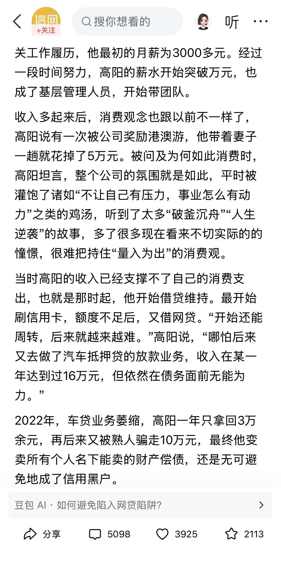 这种家庭的生活消费模式,太多了。随便去街上找一些路人采访,百人中有几人在刷卡借贷,真的全是个人原因吗?只能私下叹息一声,当作日常八卦谈资。更多的人反而会谴责她家的消费模式,却不会去深究根本原因,因为深层原因没人能谈、敢谈,也没资格谈。人生就是这样,上完一当又一当,当当有人上。