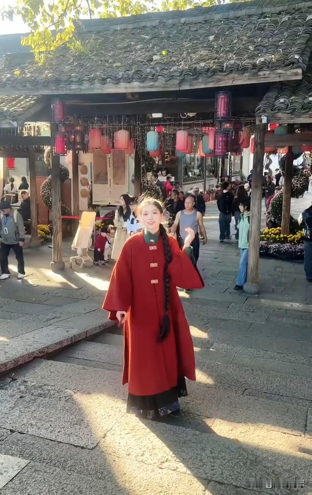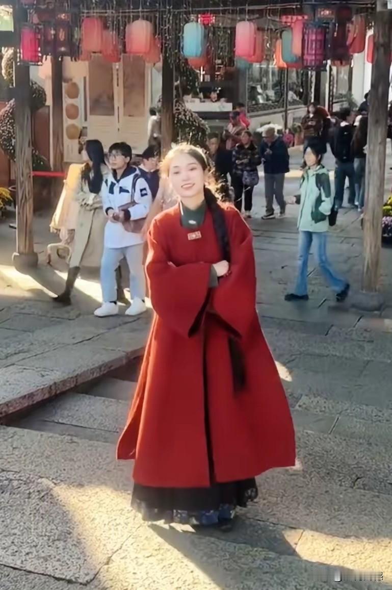 女子的这条大辫子,配上这件红色的衣服,看起来特别的醒目,特别容易吸引别人的目光,看起来特别的喜庆,简直就是一道美丽的风景,在当前的这个季节,穿件红色衣服是非常暖和的,因为红色本身看起来就非常温暖,人显得也特别的精神!