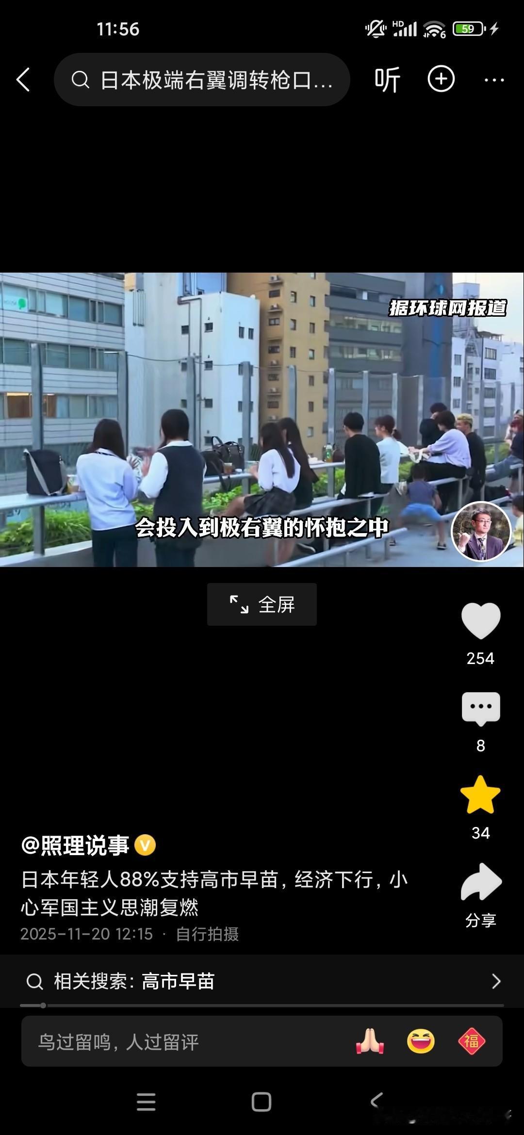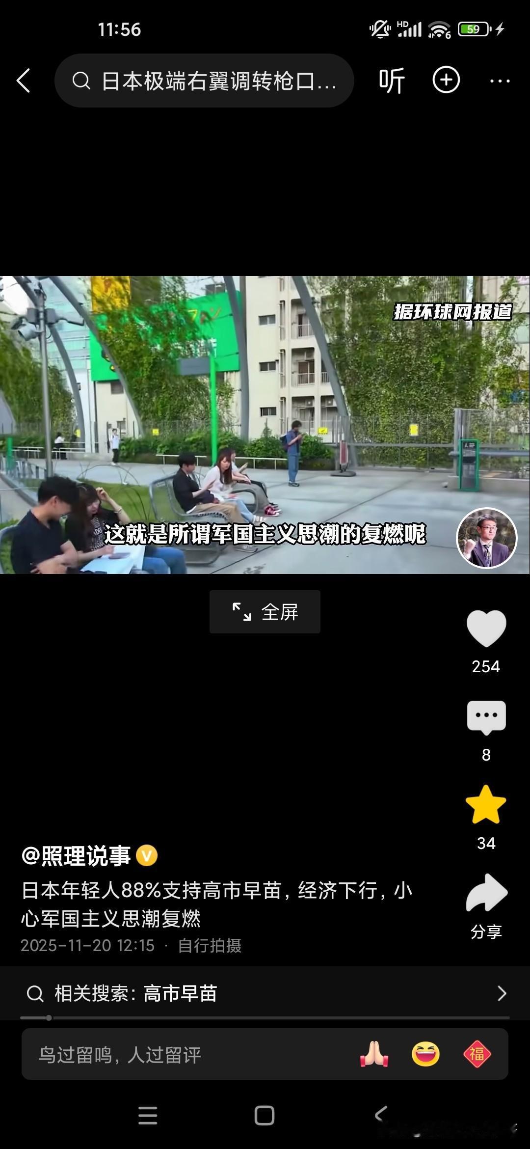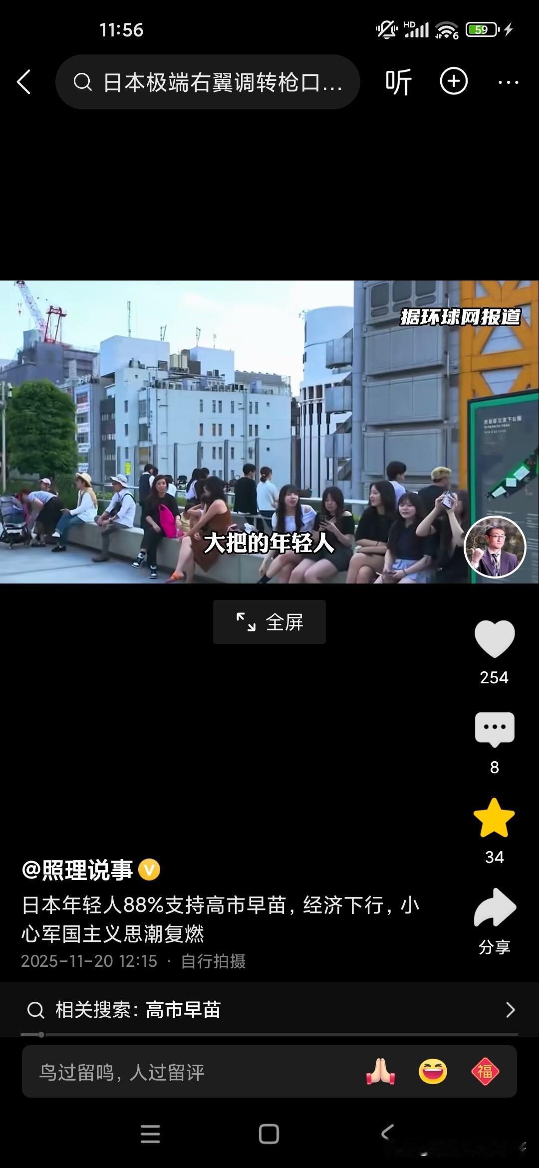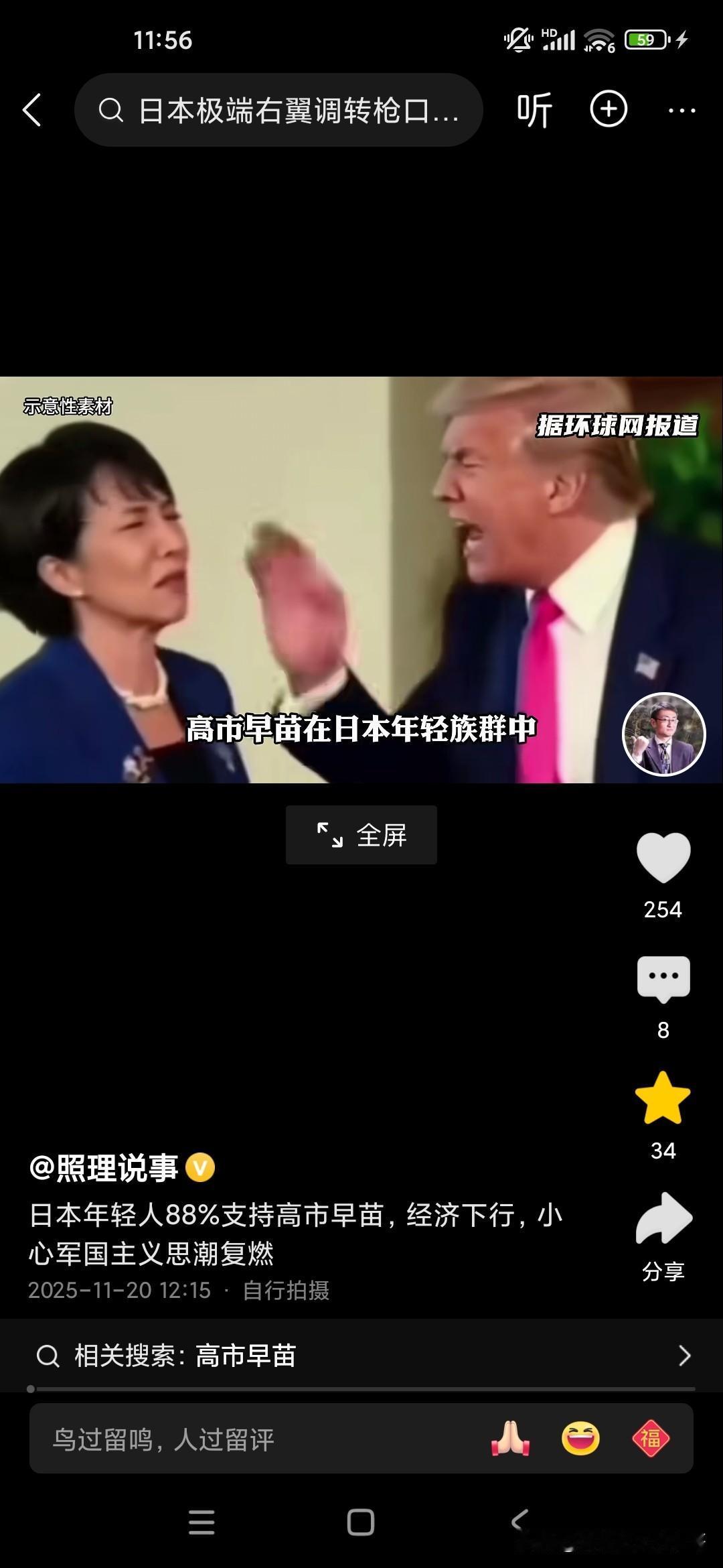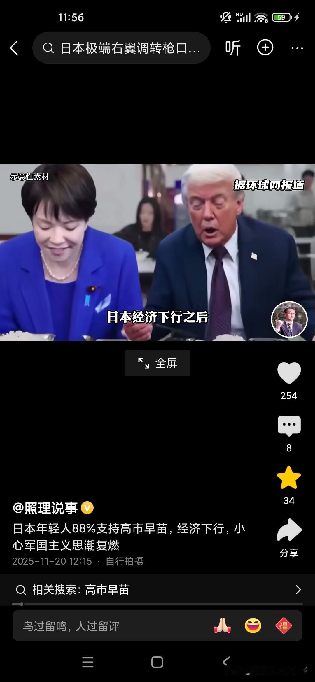 日本首相高市早苗绝对不是说口误,或者说随便不经大脑说的,你想一个国家的首相,首脑,她怎么可能随便说一句话呢?那肯定是经过深思熟虑才这样说出来的,她自己本身也是日本的右翼势力啊,本身政治根基不太稳,所以说她一直想赢得日本右翼势力和军国主义的支持,她只有说一些反华才华甚至清华的言论才能够得到国内大多数日本人民的支持,日本是一个单一民族,只有一个大和民族,如果我们收复了台湾,那么这个日本的海上生命线基本上被我们截断了,所以他们说无论如何也不愿意答应,所以说无论如何也要阻止我们收复台湾,因为我们一旦收复台湾锁定台湾海峡,他们就没有办法轻易进口石油,天然气,煤炭啊等等资源,他们是一个严重依赖外部资源的国家,我们一旦掐住了他的咽喉,他只能乖乖就范,所以说日本人想再次冒险赌一把!