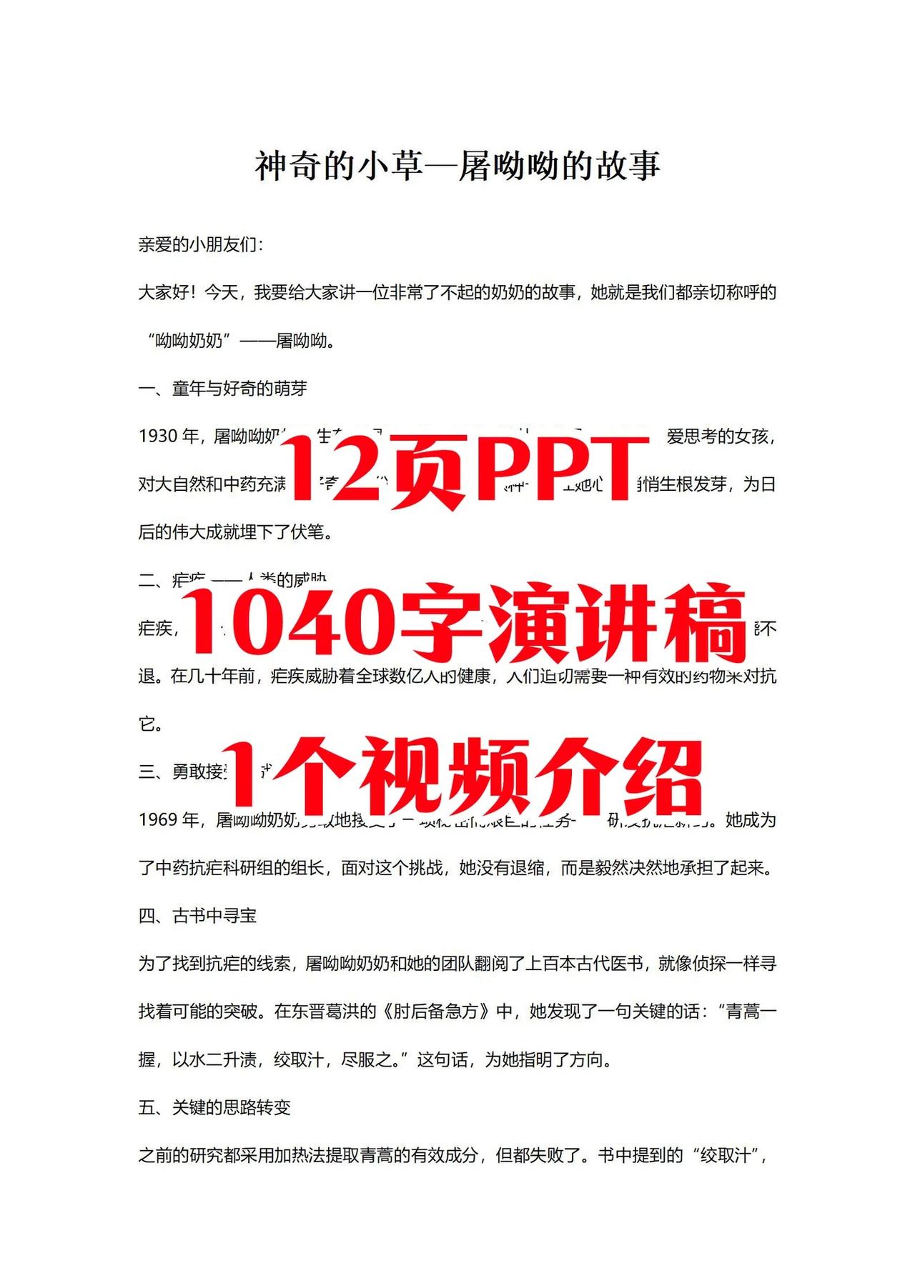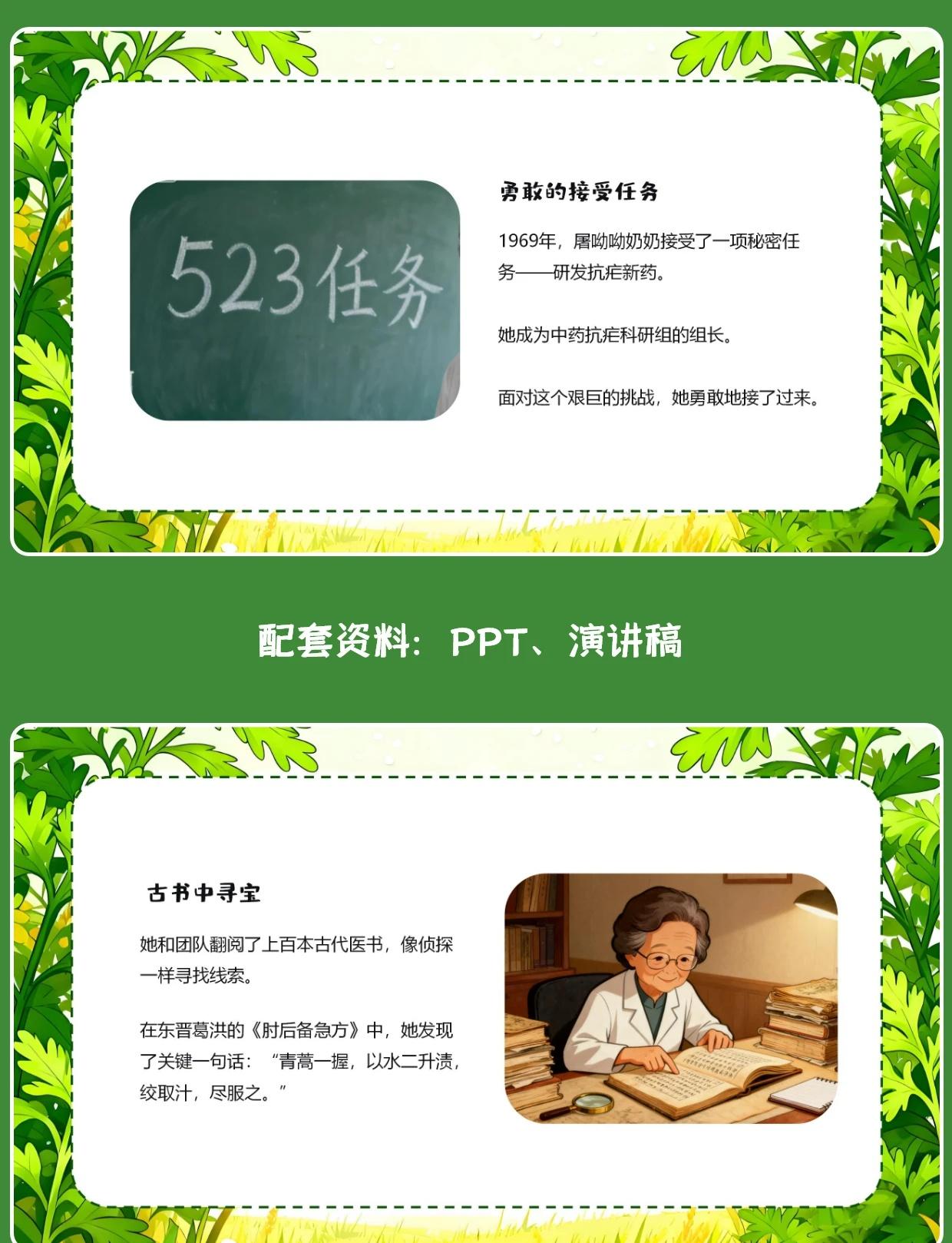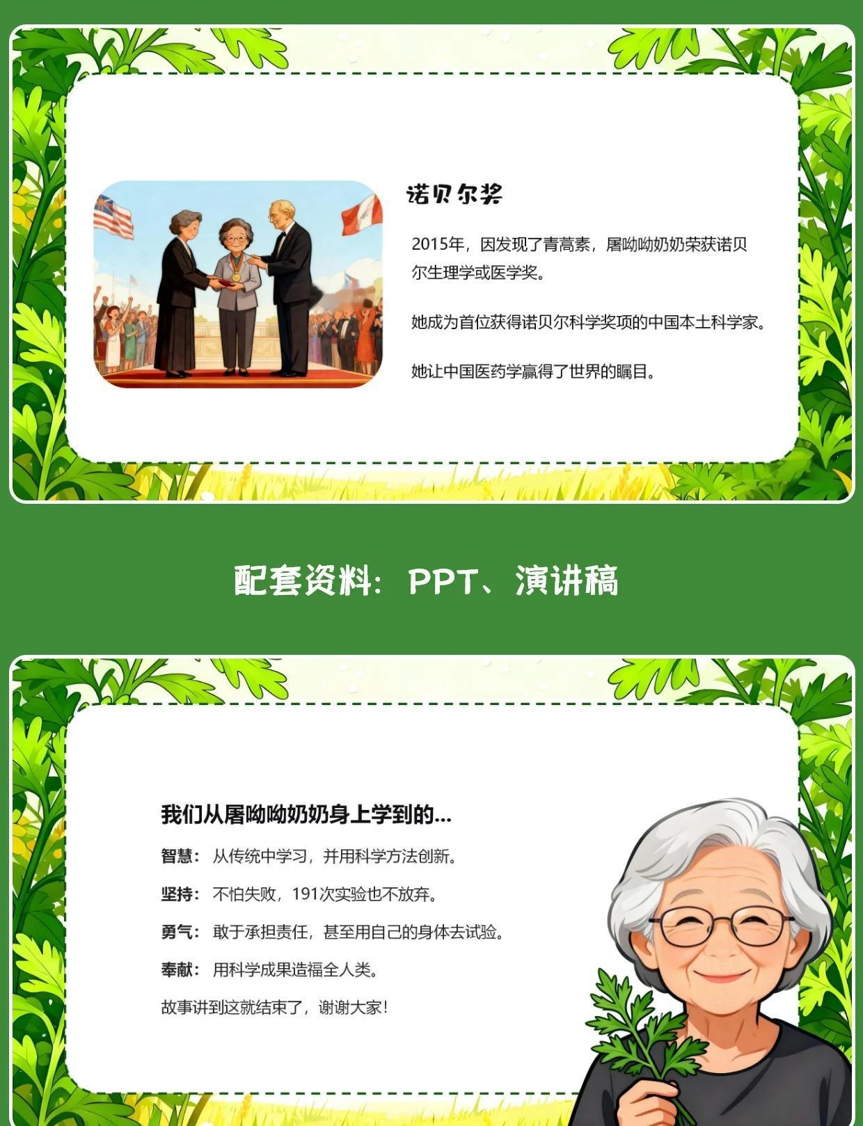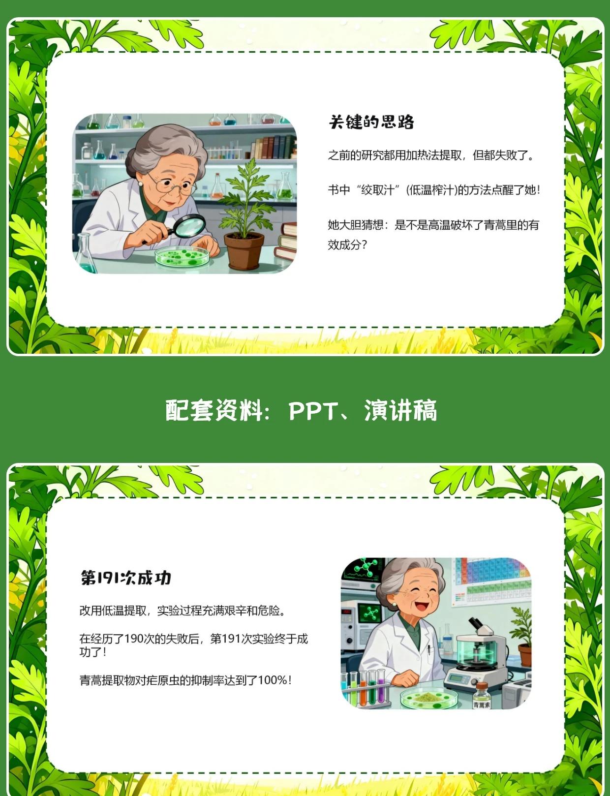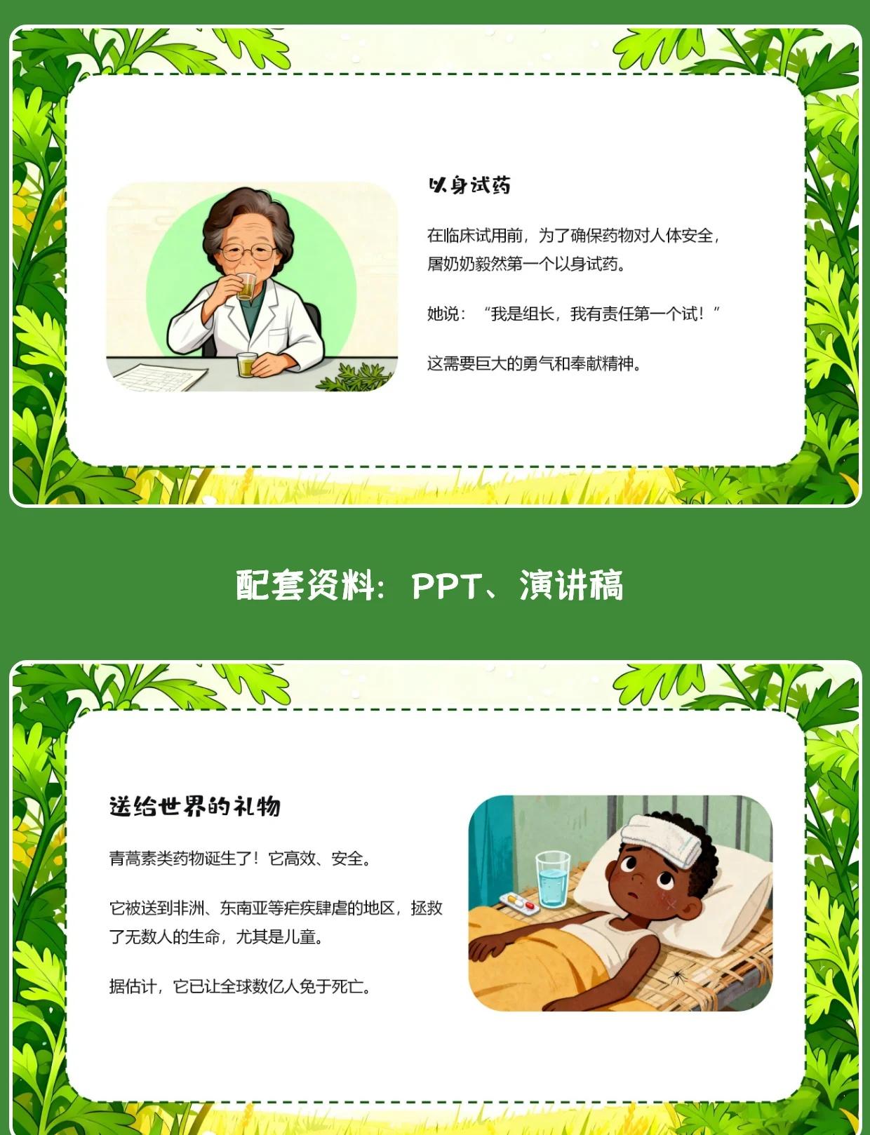 🔥科学家故事-屠呦呦奶奶PPT+演讲稿 📣亲爱的小朋友们: 大家好!今天,我要给大家讲一位非常了不起的奶奶的故事,她就是我们都亲切称呼的“呦呦奶奶”——屠呦呦。 一、童年与好奇的萌芽 1930年,屠呦呦奶奶出生在中国美丽的宁波城。她从小就是一个安静、爱思考的女孩,对大自然和中药充满了好奇。这份好奇,就像一颗种子,在她心里悄悄生根发芽,为日后的伟大成就埋下了伏笔。 二、疟疾——人类的威胁 疟疾,这个通过蚊子传播的可怕疾病,曾被称为“瘟疫”。它让患者忽冷忽热,高烧不退。在几十年前,疟疾威胁着全球数亿人的健康,人们迫切需要一种有效的药物来对抗它。 ...... 屠呦呦 科学家故事 科学家屠呦呦 致敬伟大的科学家 科学家精神 科学家故事 ppt 儿童故事