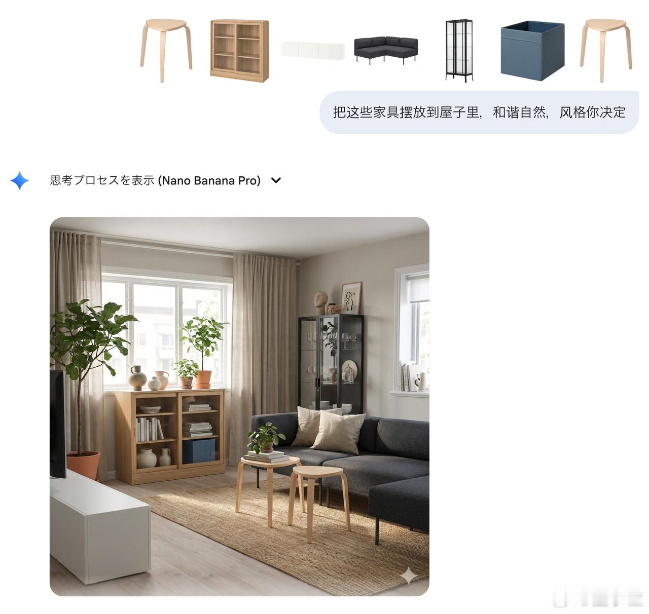 谷歌最新生图模型Nano Banana Pro,能直接出家具摆放效果图。【图1】上传木质凳子、黑色沙发、白色柜子、蓝色收纳盒和木质书架。结果生成的客厅画面毫无违和感,那个蓝色收纳盒直接放到书架里了,还自己给书架摆放了其他物品。从测试效果来看,它不仅能理解每件家具的空间关系,还能自动协调光影和整体氛围,让原本不相干的物件和谐自然。这对室内设计、电商展示或者虚拟场景搭建来说,实用价值相当高。以后可能真的可以直接用AI来预览家具搭配效果了。
