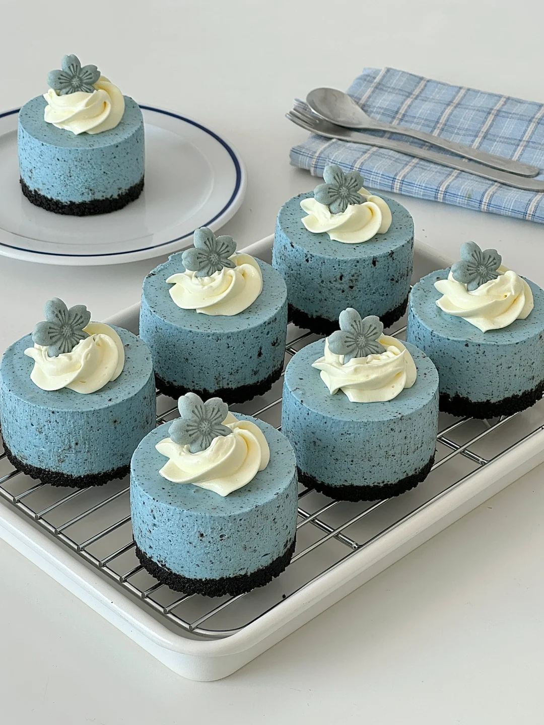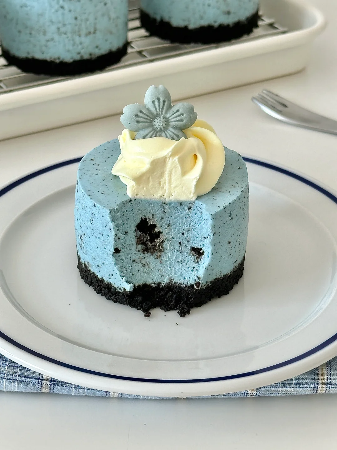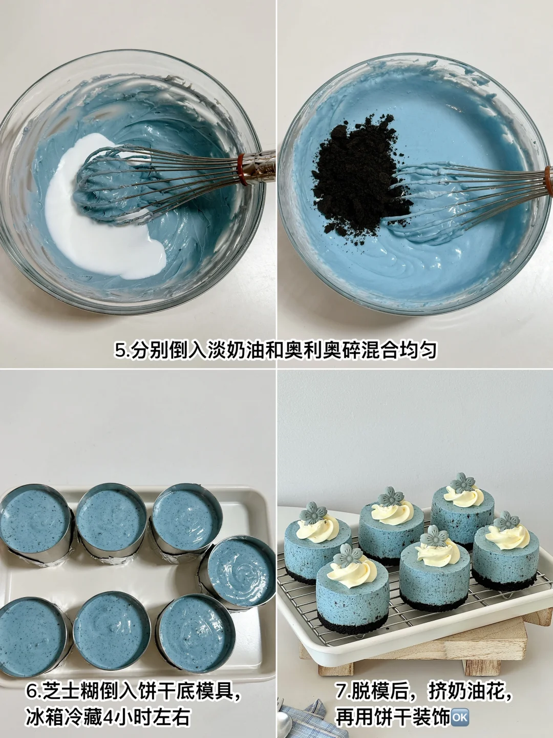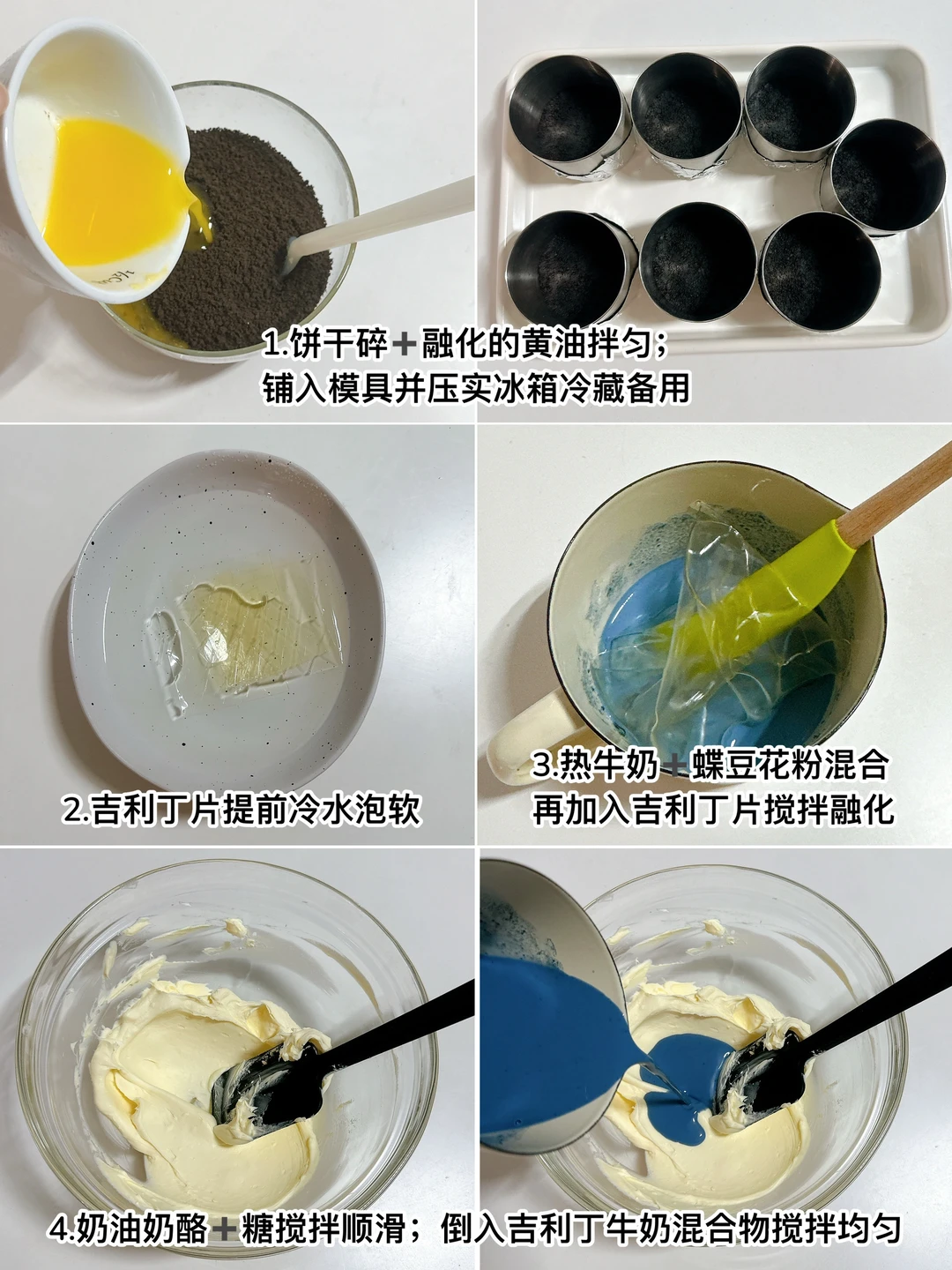 淡奶油180g|奶油奶酪200g|白糖60g|吉利丁片7g|热牛奶50g|蝶豆花粉6g|奥利奥碎20g