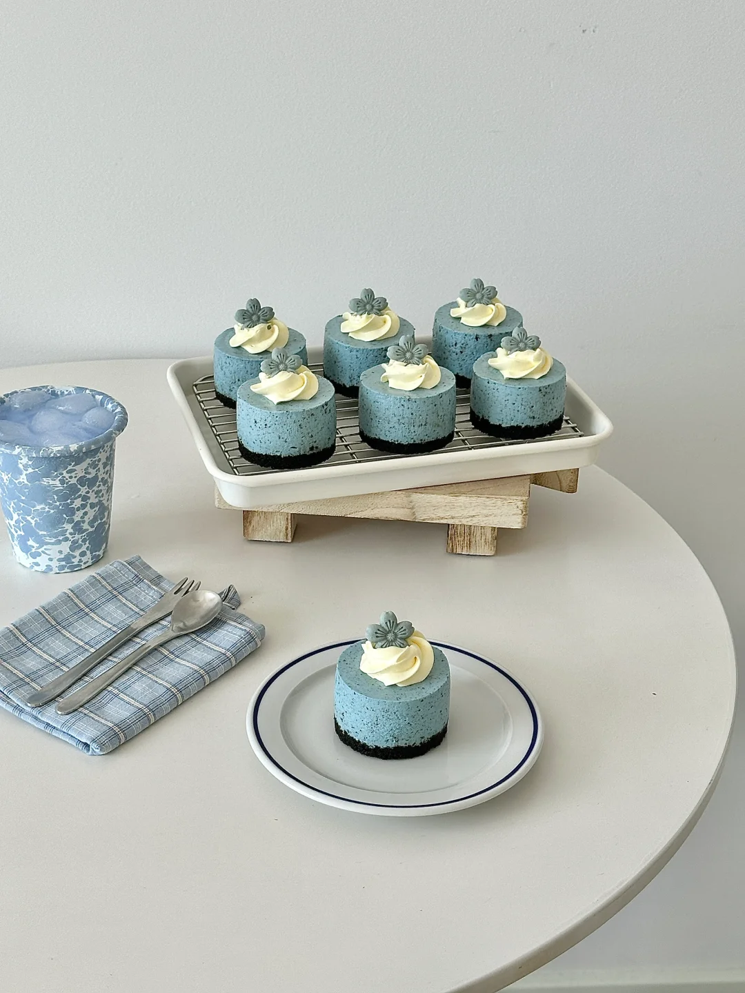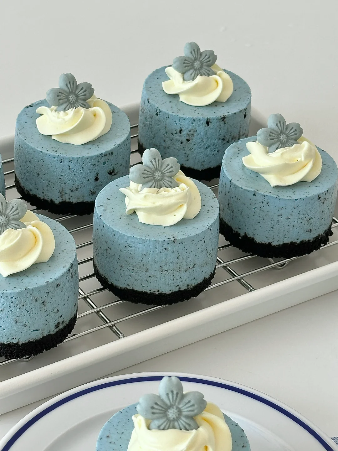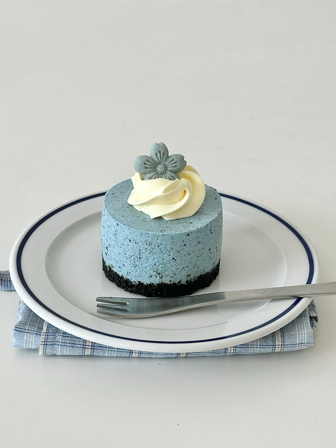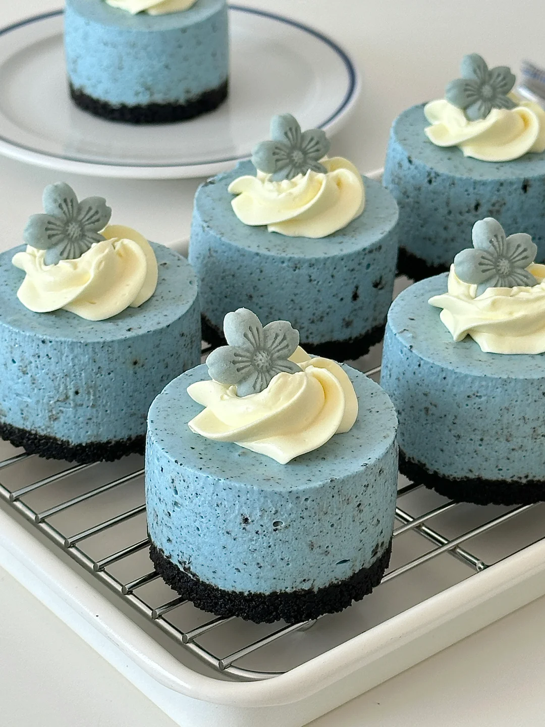 淡奶油180g|奶油奶酪200g|白糖60g|吉利丁片7g|热牛奶50g|蝶豆花粉6g|奥利奥碎20g