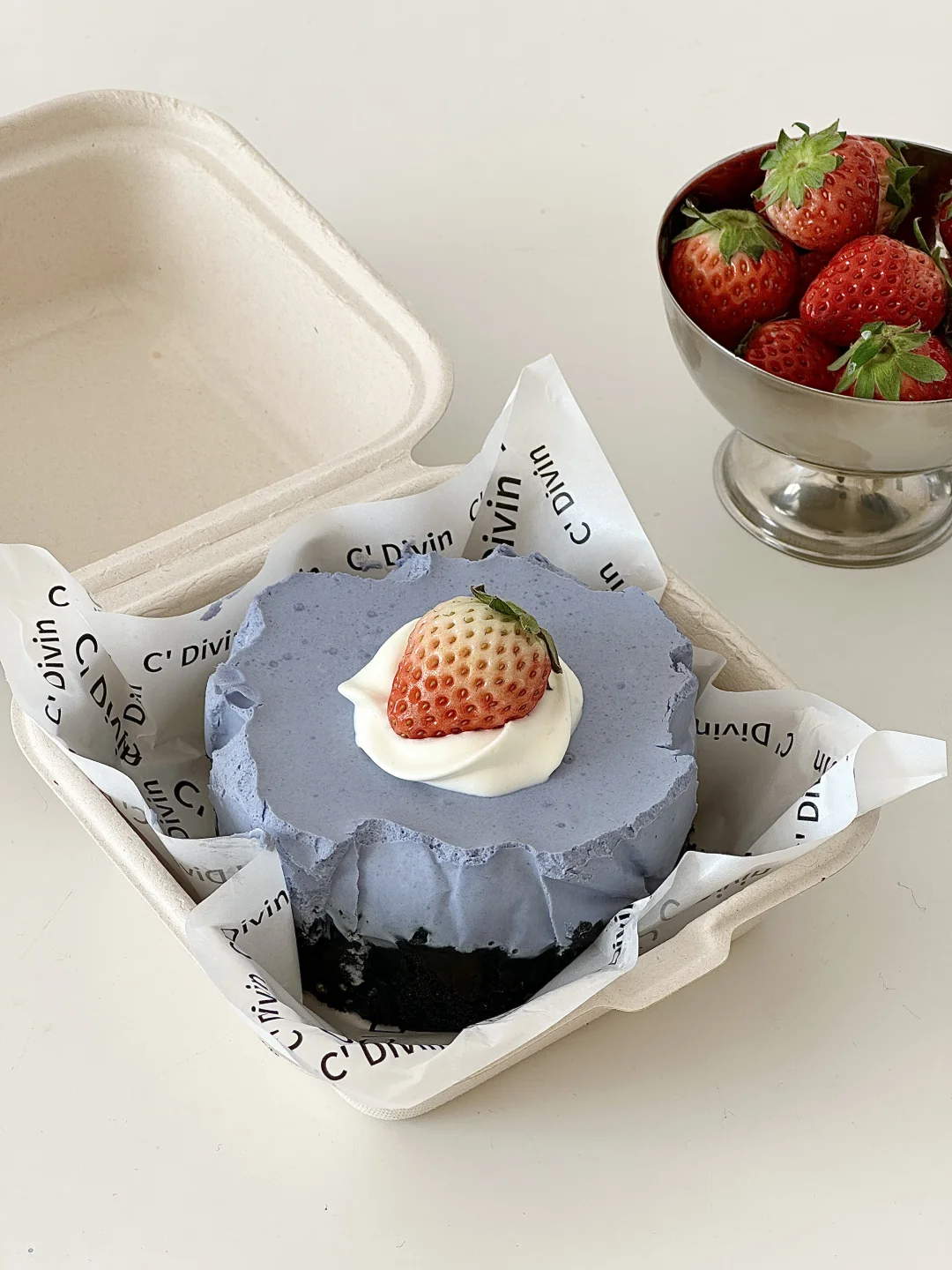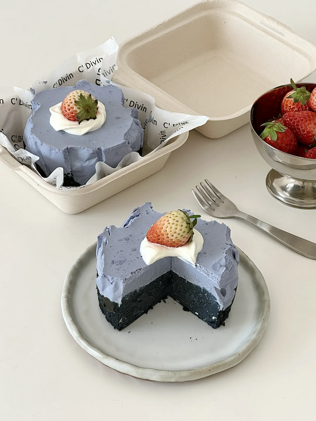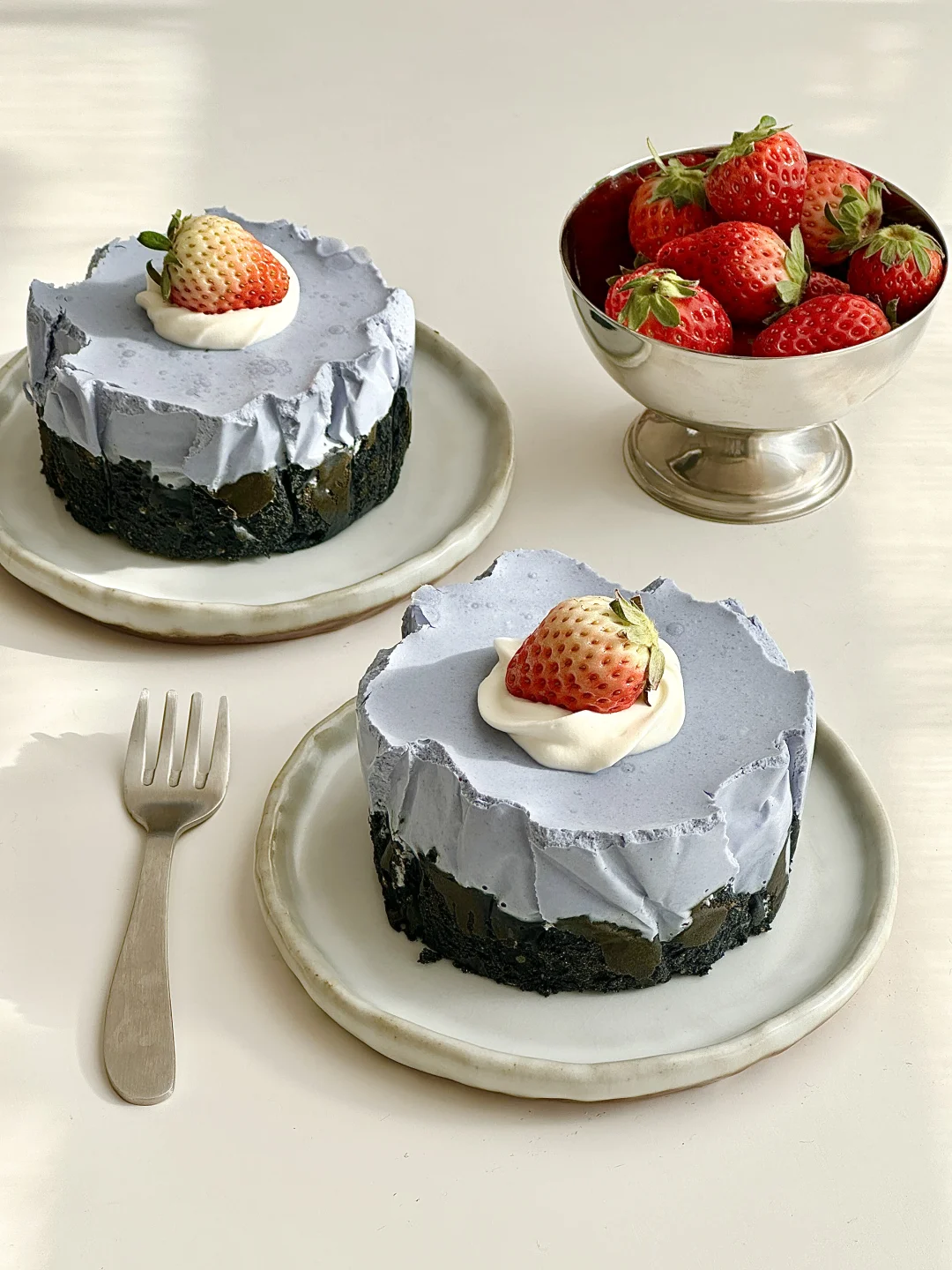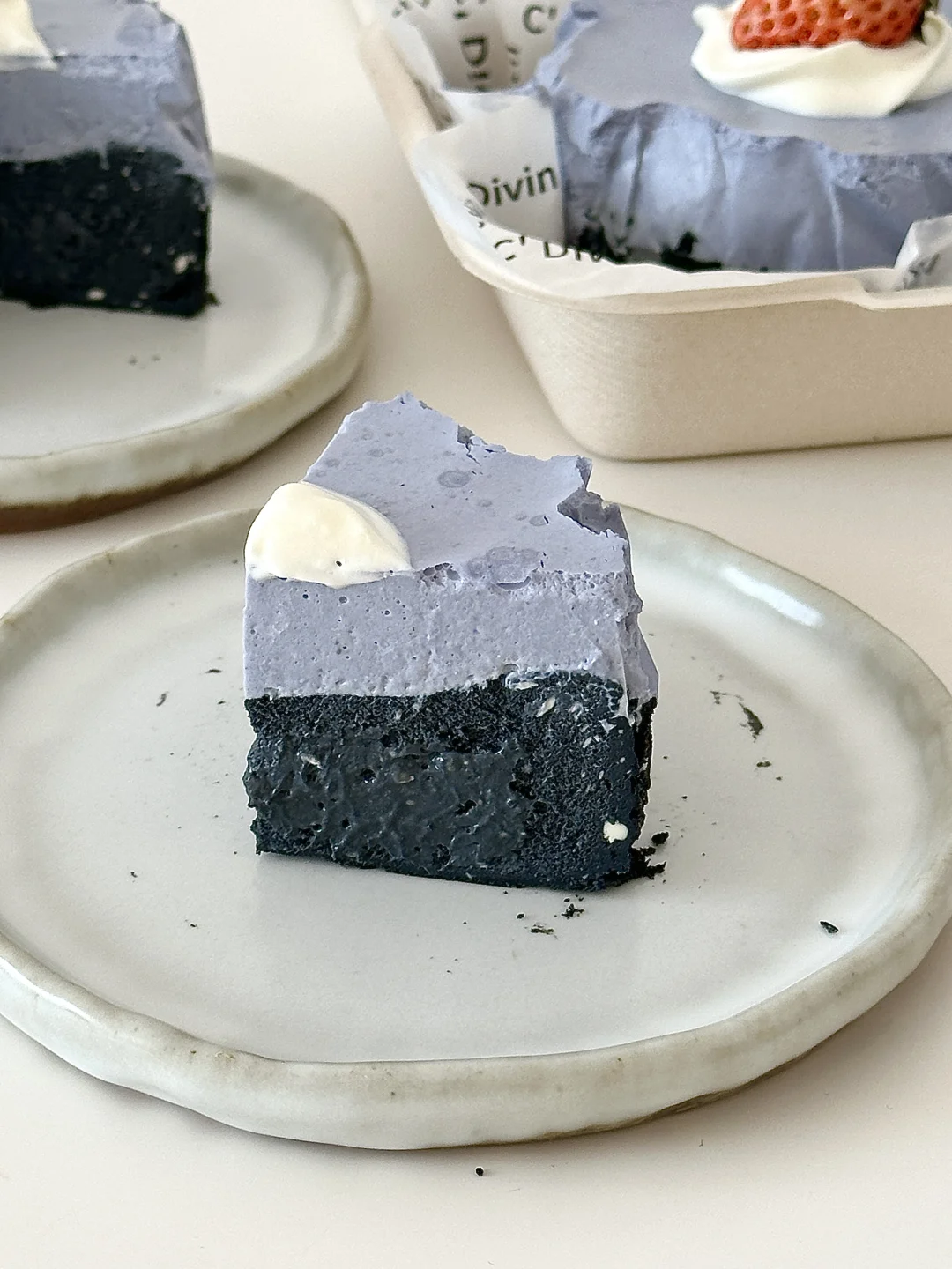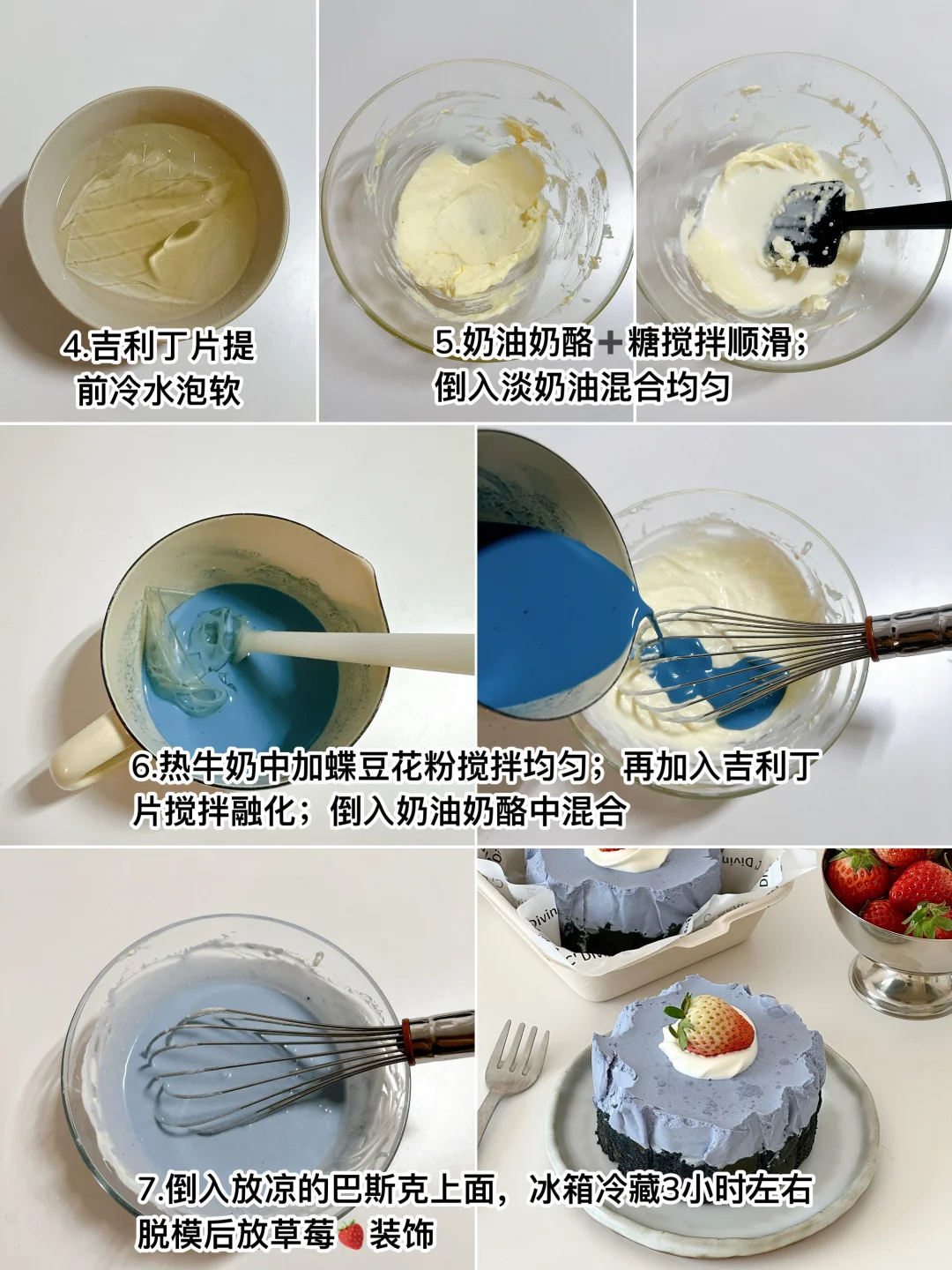 5.热牛奶中加蝶豆花粉搅拌均匀,加冷水泡软的吉利丁搅拌融化,倒在巴斯克上面,冰箱冷藏3小时