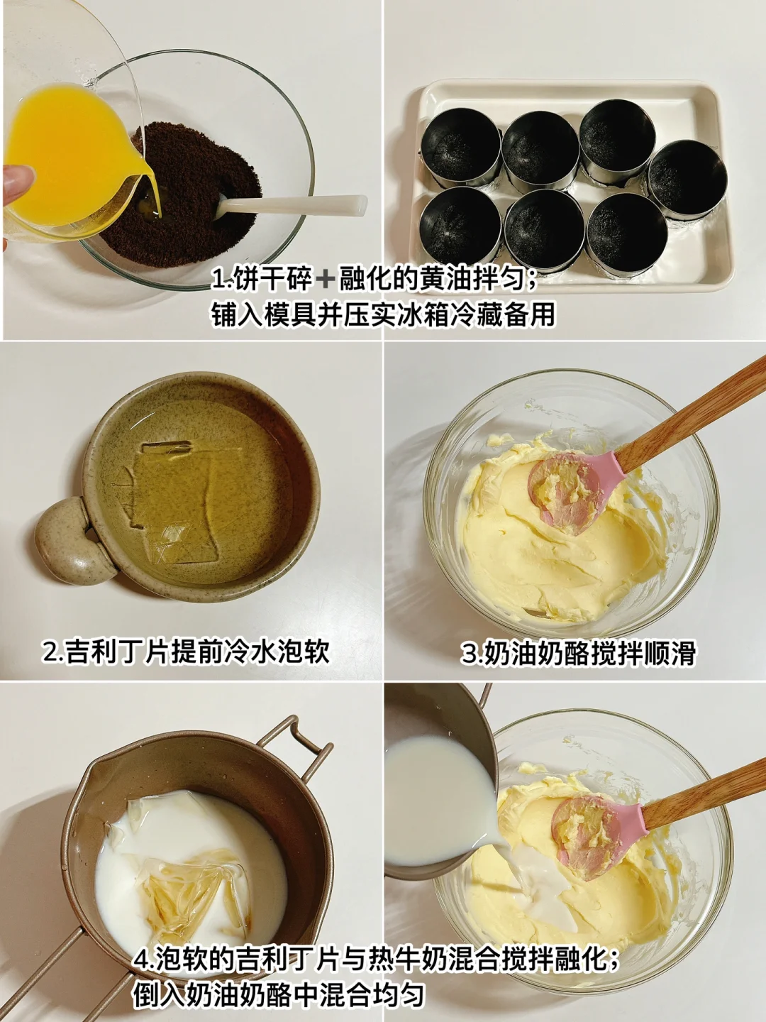 ❶饼干碎➕融化的黄油拌匀,压入模具冰箱冷藏备用