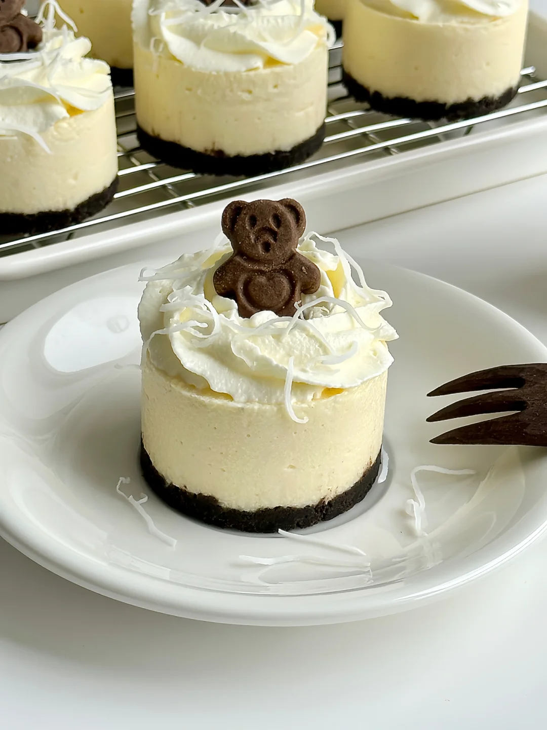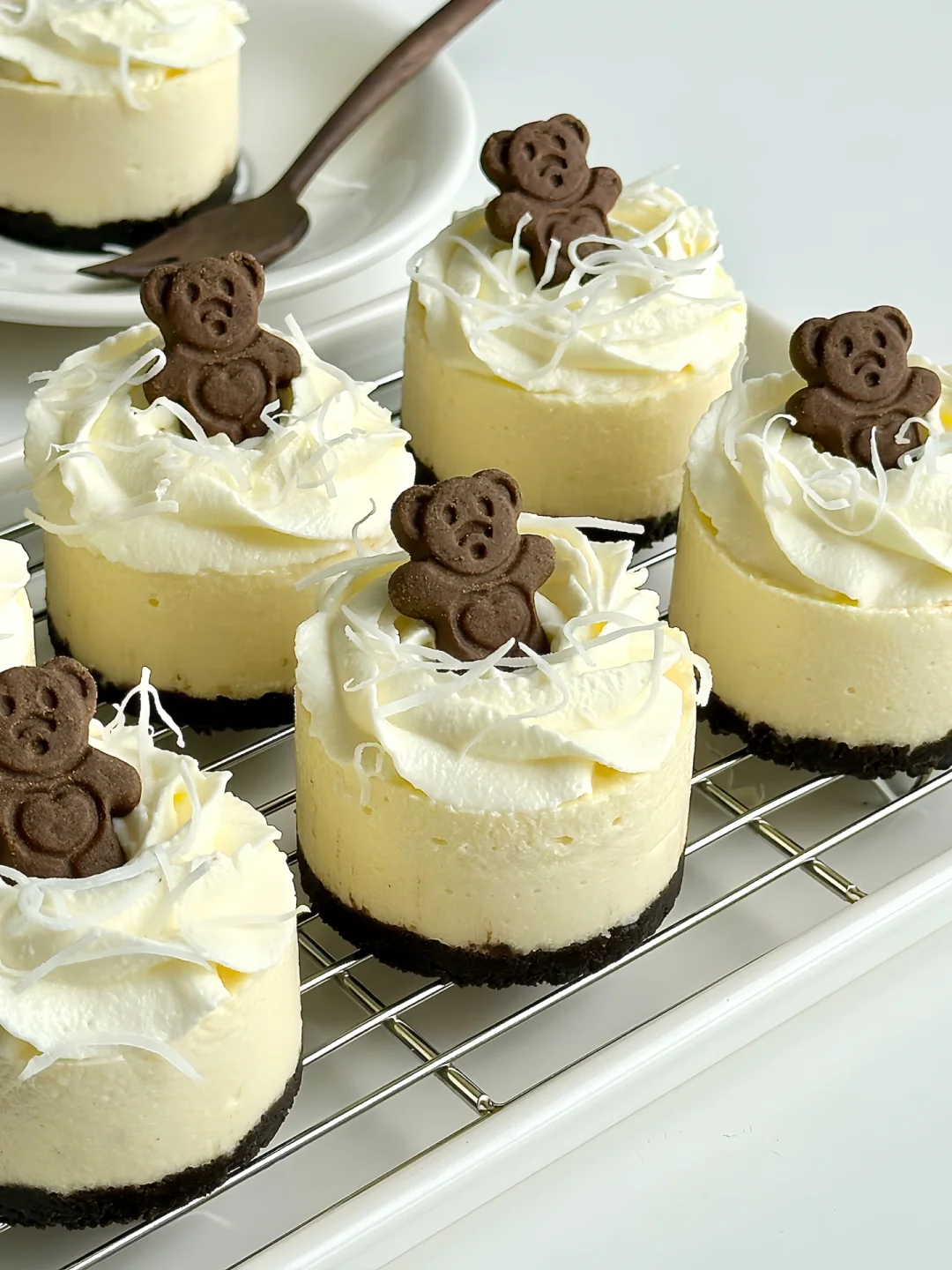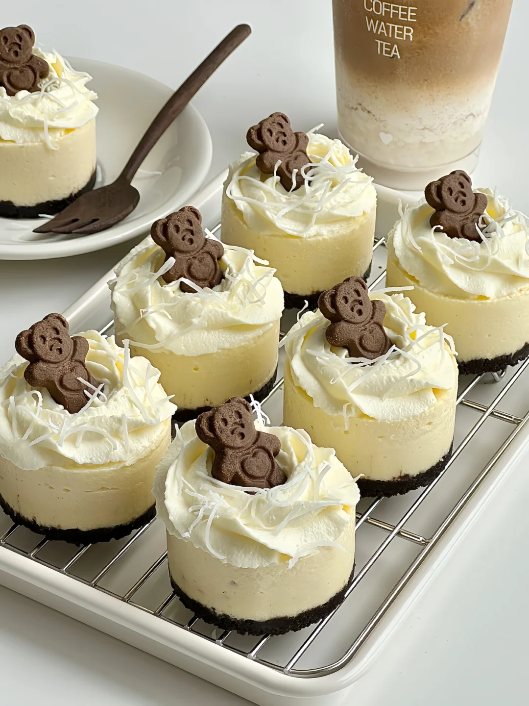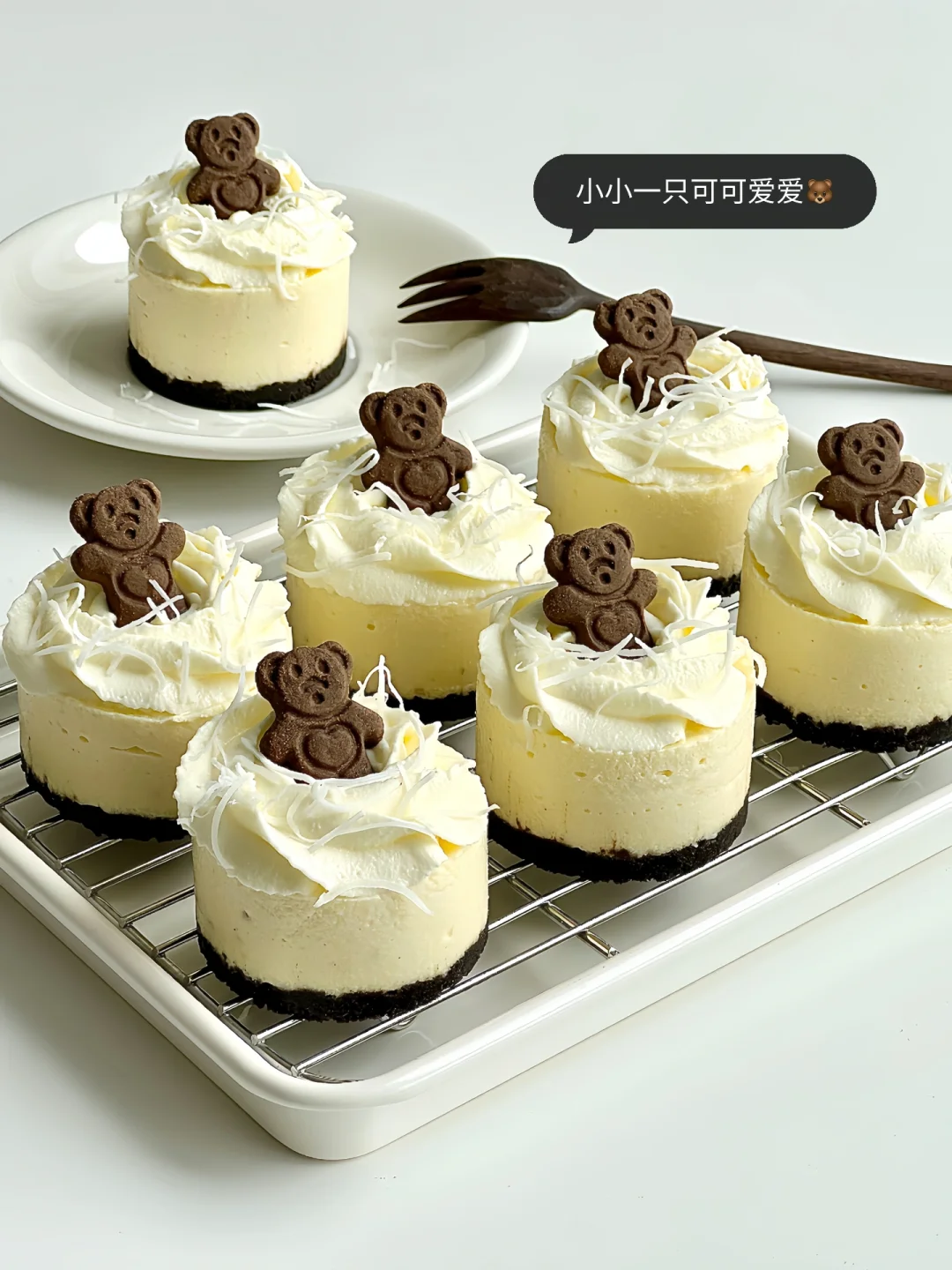 ❺蛋糕上面挤奶油花,再放🐻饼干和椰丝装饰即可