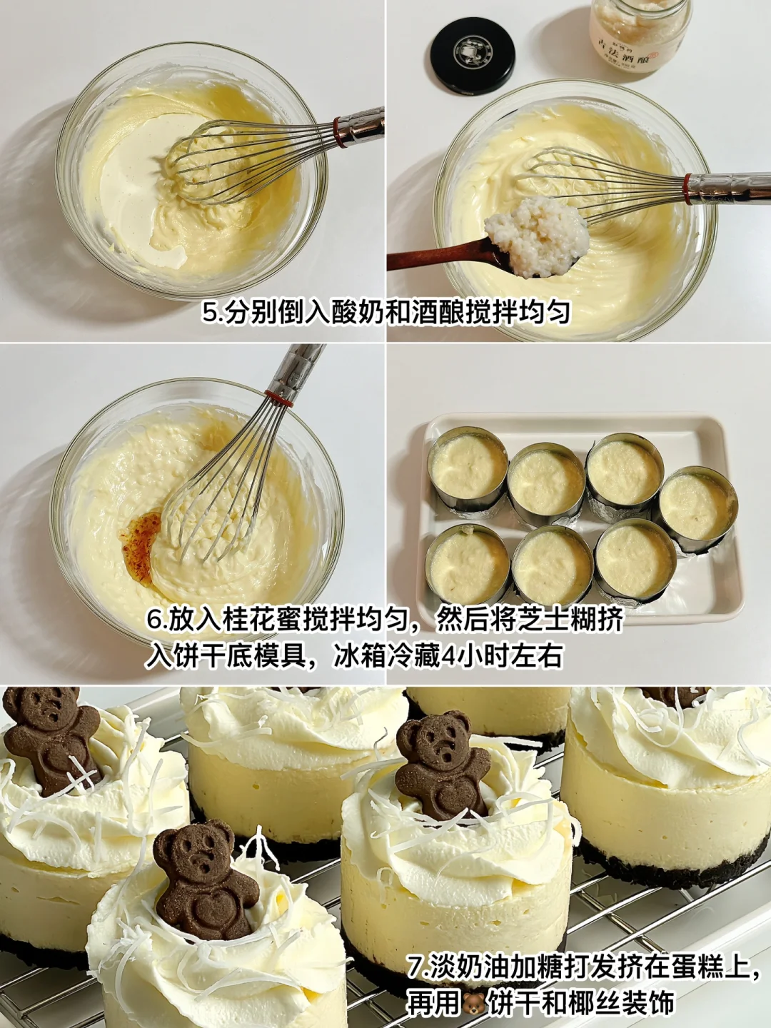 ❹分别倒入🫗酸奶、酒酿和桂花蜜混合均匀,挤入饼干底模具,入冰箱冷藏❄4小时左右脱模