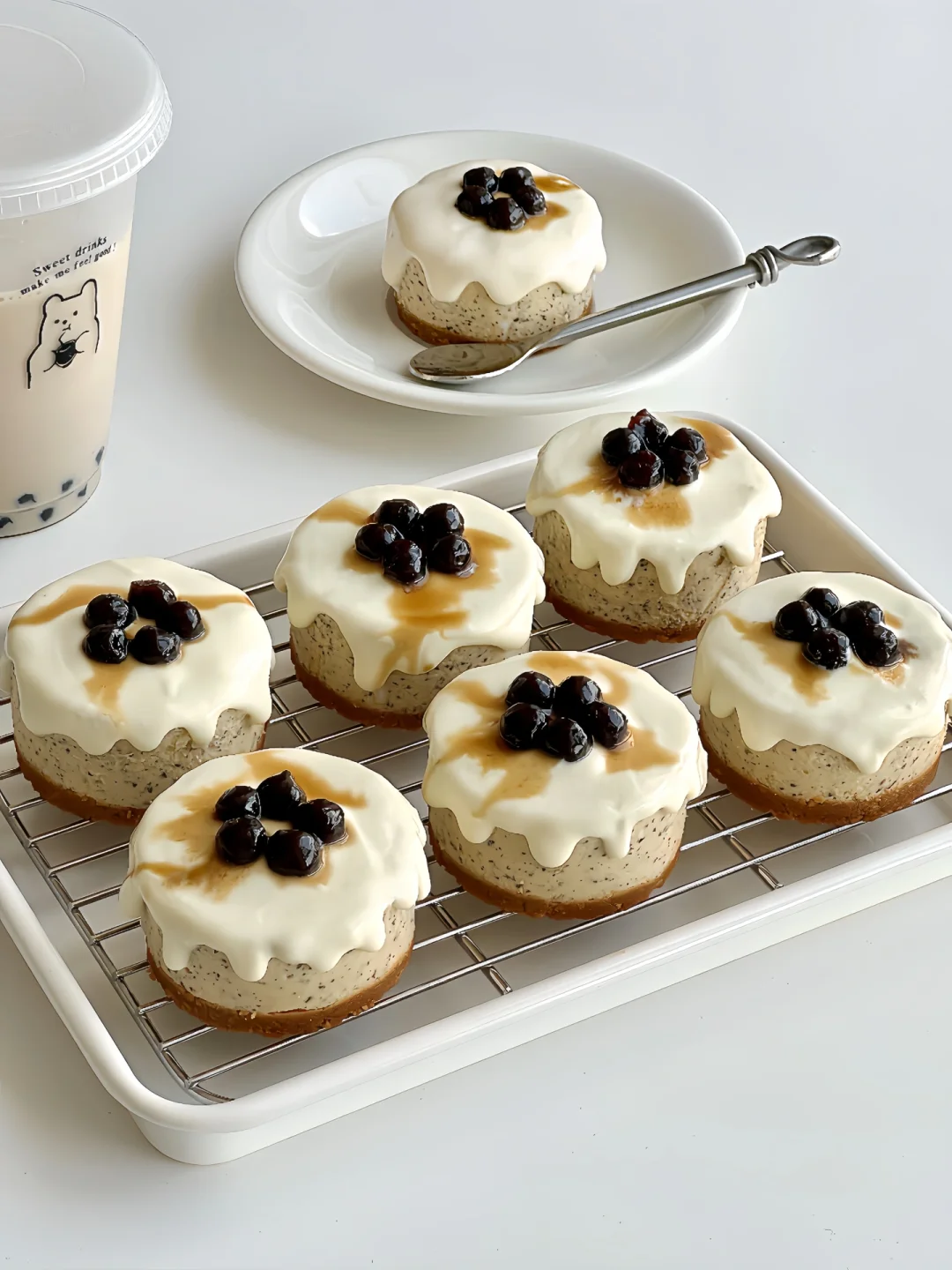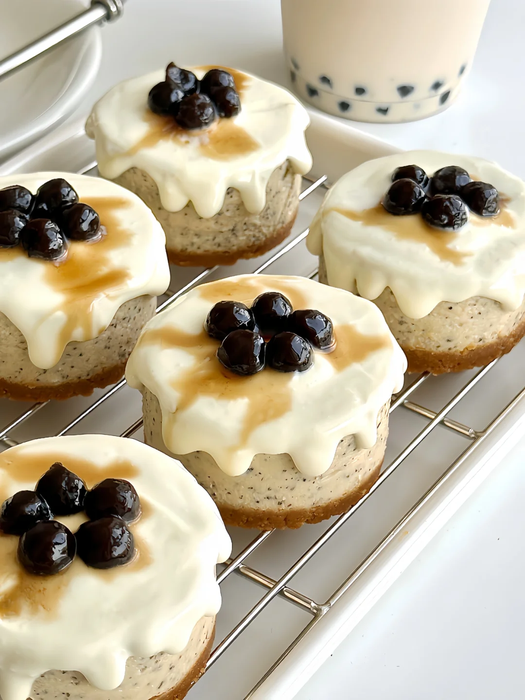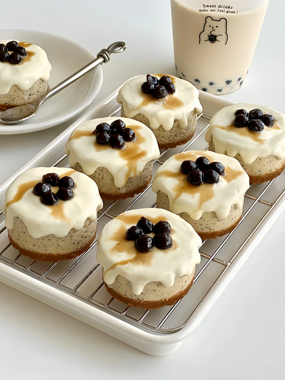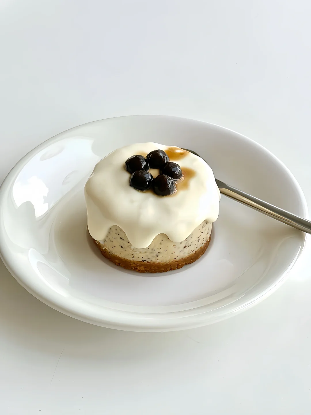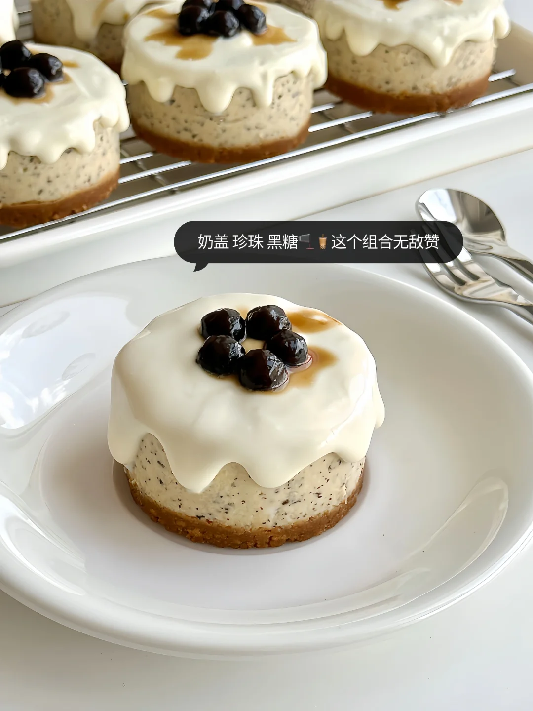 ❺奶盖食材中的奶油奶酪➕糖➕淡奶油混合均匀,再倒入适量牛奶调成酸奶状,抹在蛋糕上,然后放上珍珠,淋点黑糖即可