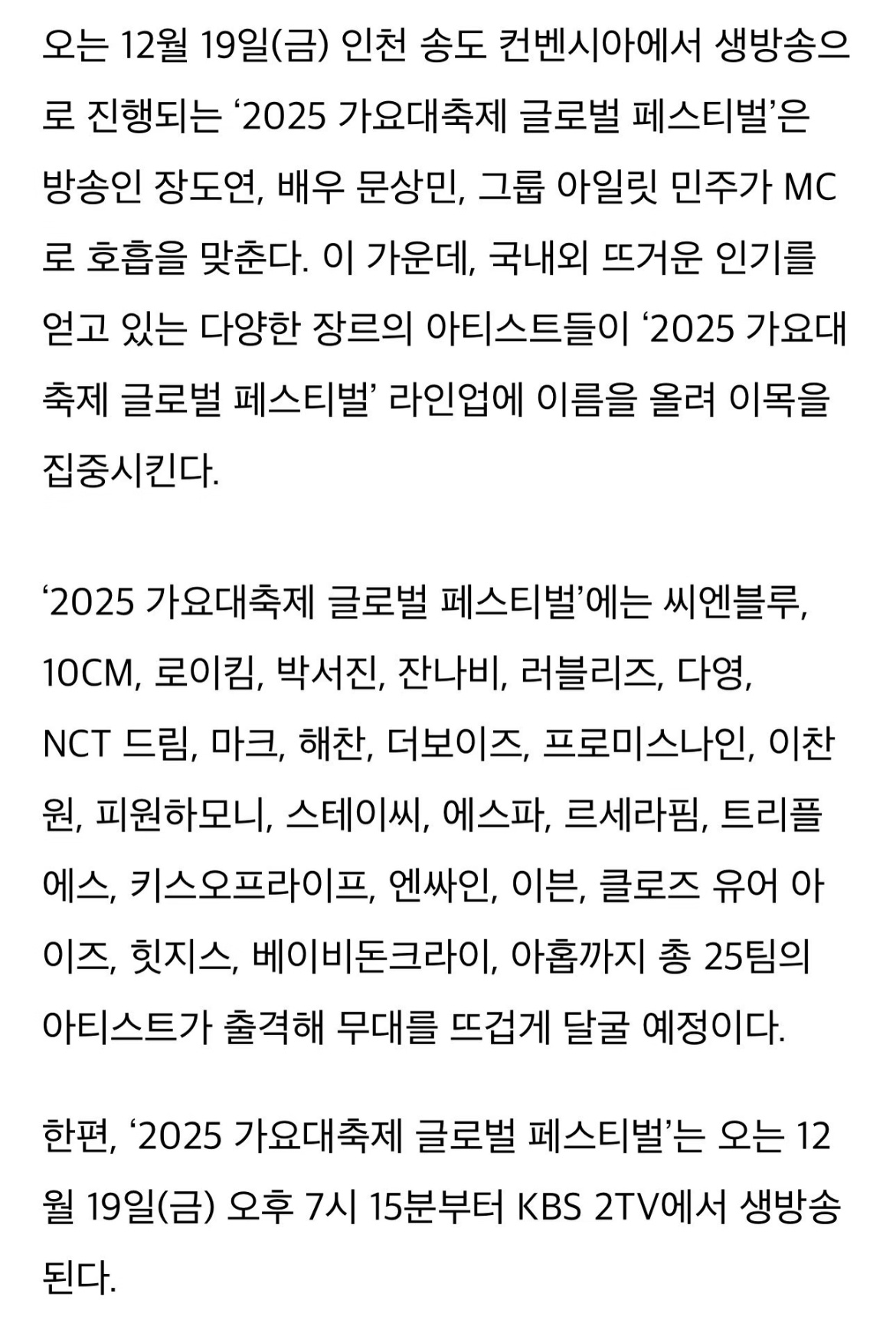 KBS歌谣大庆典官宣艺人阵容CNBLUE、10CM、Roy Kim、朴瑞镇、Jannabi、Lovelyz、多荣、NCT Dream、李马克、楷灿、THE BOYZ、fromis_9、Stay C、aespa、Lesserafim、TripleS、Evnne、Close Your Eyes、Highes、Babydon Cry等共25组艺人将出击,点燃舞台🎶