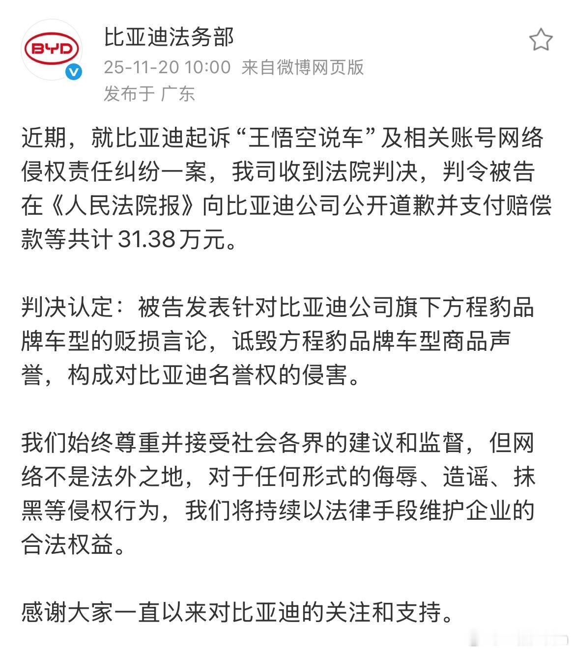 就最近,比亚迪起诉自媒体账号“王悟空说车”网络侵权责任纠纷案迎来判决结果。法院认定,被告针对比亚迪旗下方程豹品牌发布的贬损言论侵犯企业名誉权,判令其公开赔礼道歉,并支付赔偿款等共计31.38万元。据悉,该账号此前已因多次恶意抹黑汽车企业、歪曲事实诋毁新能源汽车,被中央网信办在专项整治中依法处置。作为新能源汽车头部企业,比亚迪长期坚守合法经营底线,面对“黑公关”侵扰始终坚定维权。,比亚迪自2021年起设立黑公关举报悬赏,2022年将最高奖励提升至500万元,持续通过法律手段反击侵权行为。此次判决既捍卫了企业合法权益,更以司法实践引导行业回归理性竞争,为中国新能源汽车产业高质量发展注入持久动力。