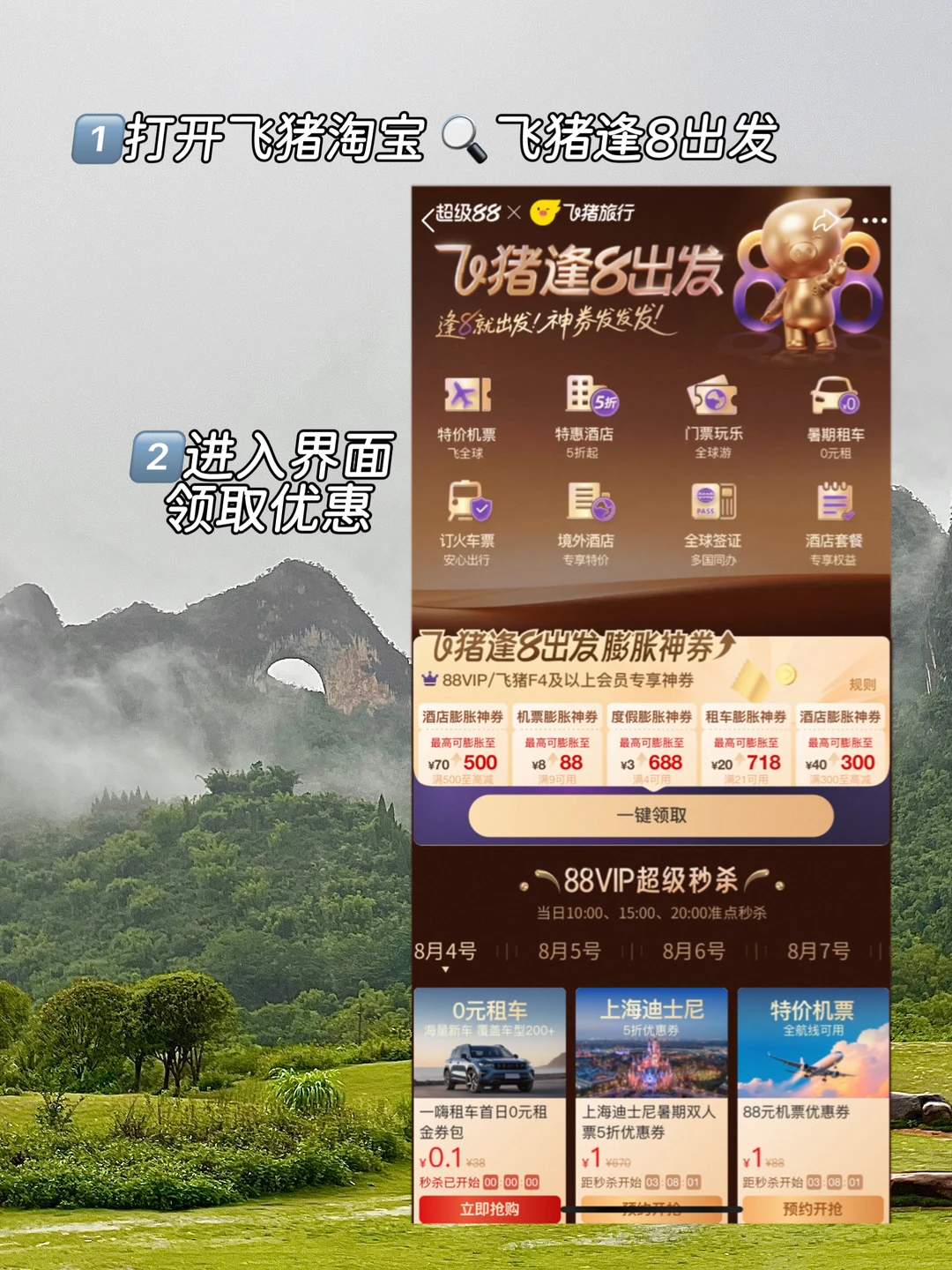 1️⃣上飞猪or淘宝🔍【飞猪逢8出发】领取限量优惠券(方式见P3)