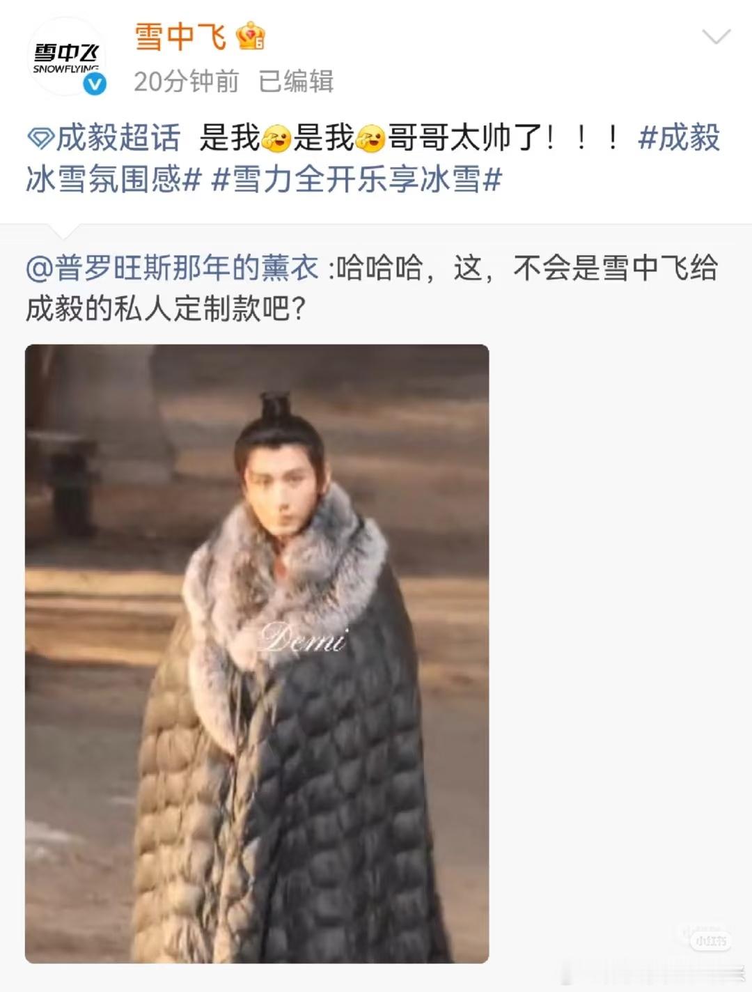 雪中飞给成毅定制了一件羽绒大氅,好有心啊。能不能出个类似款啊,这个好实用,我们以