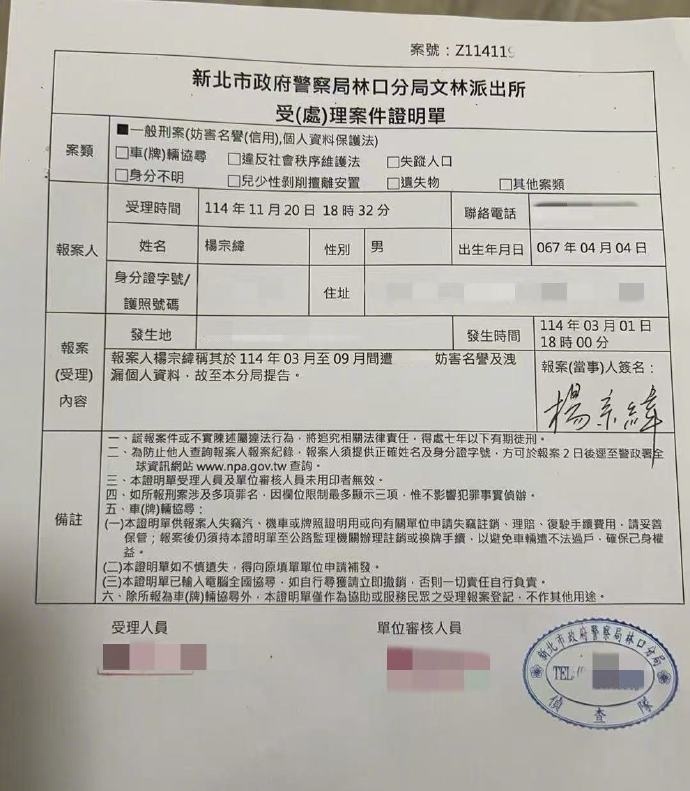 11月20日,杨宗纬向新北市警局林口分局报案。指控2025年3月至9月期间遭匿名用户捏造“恶邻”不实信息,包括“占用公共空间”“家人随地便溺”等,并泄露其个人隐私,涉及妨害名誉及违反台湾《个人资料保护法》。11月19日,有台媒报道称杨宗纬在担任社区管委会主委期间被部分住户指控为“恶邻”,包括家人随地便溺、占用公共空间、破坏公物等,引发热议。11月20日,杨宗纬晒出受理案件证明单,并发文:“尊重每个人的选择,相信所有行为都会带来相应的后果。坚持做正确的事,也相信世界自有其平衡之道。”