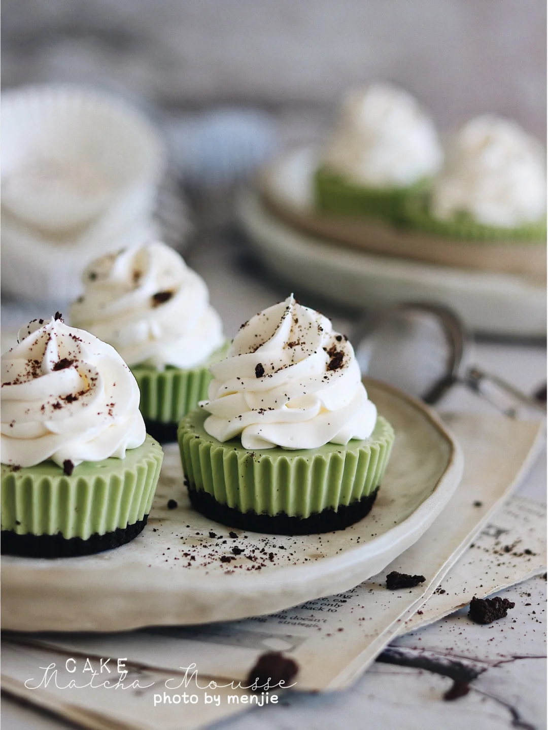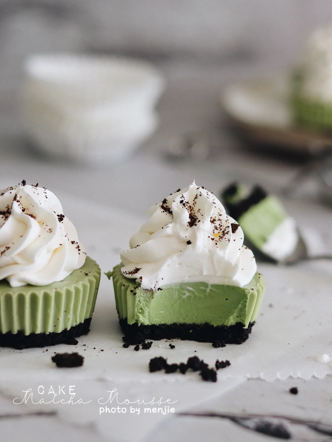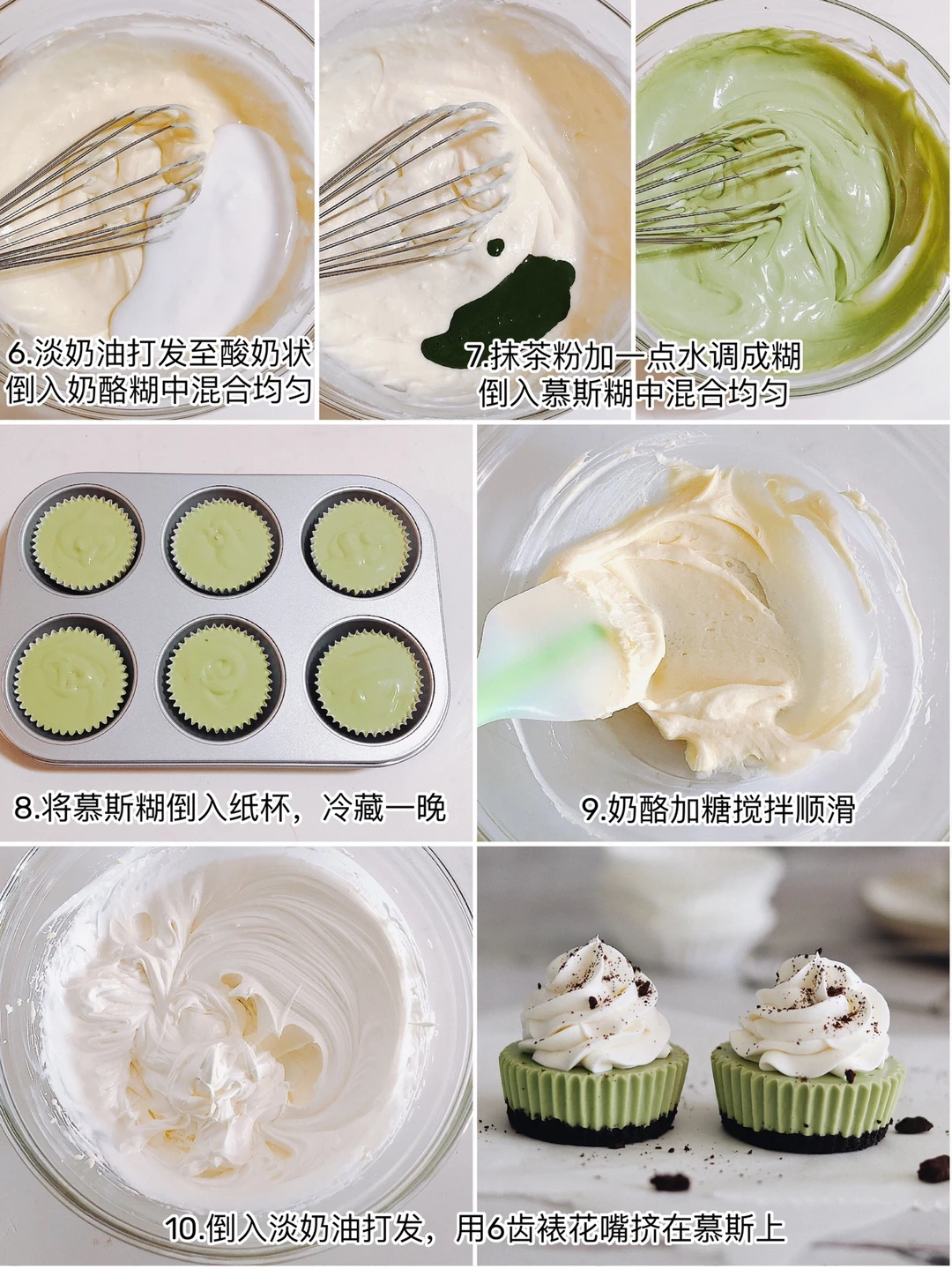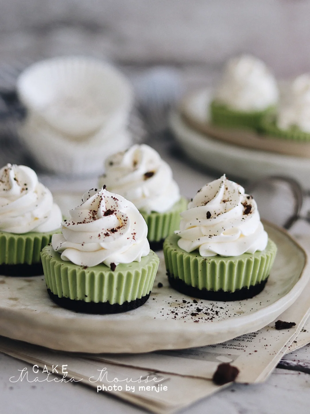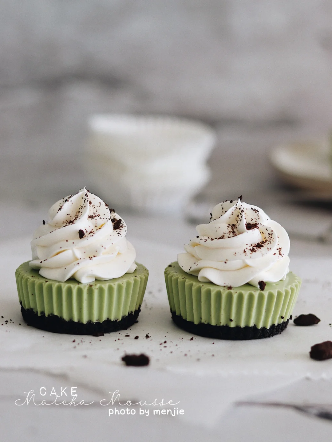 ❺抹茶粉加一点水调成糊,倒入慕斯糊中混合后,倒入纸杯中