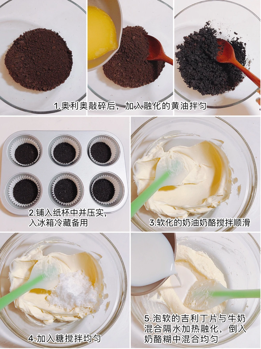 ❶奥利奥敲碎,加入融化的黄油拌匀,铺入纸杯中并压实,入冰箱冷藏备用