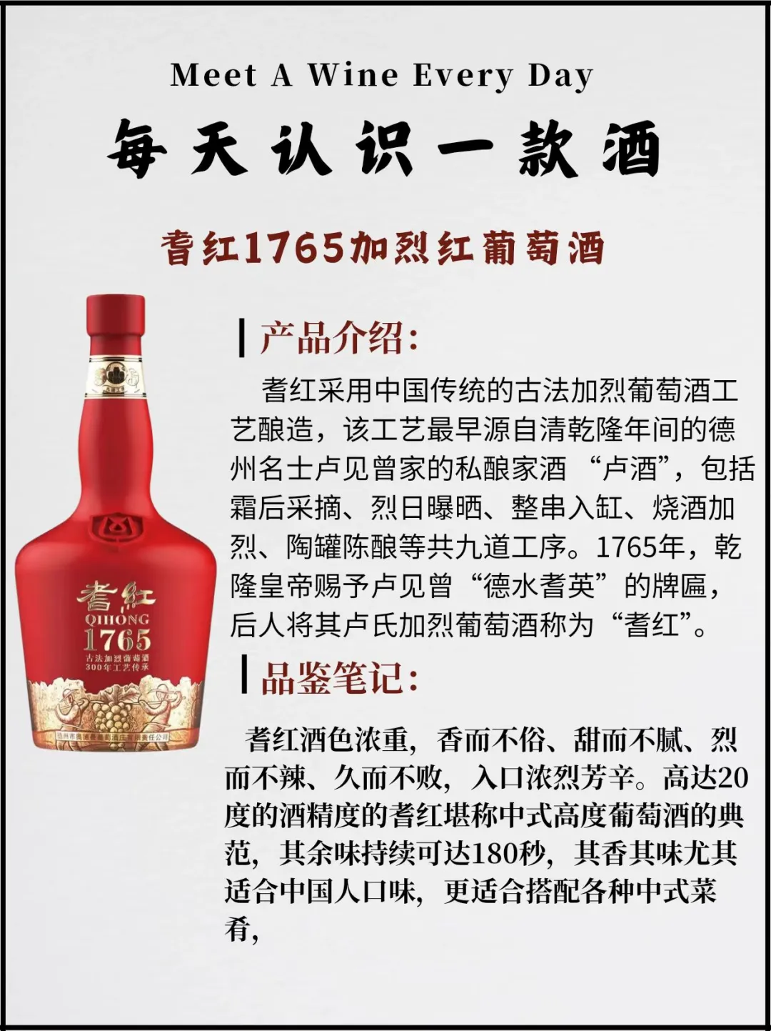🌟耆红,是一款加烈葡萄酒;耆红,是一款具有中国风格的国产葡萄酒。从酿造工艺上讲,加烈葡萄酒并非中国独有,世界上比较有名的加烈葡萄酒(即加强型葡萄酒)还有葡萄牙的波特酒和西班牙的雪莉酒。这一款耆红加烈葡萄酒,在酿造工艺上虽然也有类似波特酒的加烈工序,但是整体工艺上有着自己独特的风格,与西方的加烈葡萄酒酿造有着很大的区别。