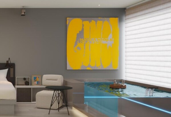 除此之外,尚客优7酒店还首次推出了专为年轻人设计的"室内无边泳池房"。在28㎡面积内,首次设计2x4米室内无边泳池,可泡澡放松,松弛感拉满,并搭配150英寸高清巨幕与专业音响,打造沉浸式影音体验,单房造价也在8万元/间,预估售价200-300元/间夜。