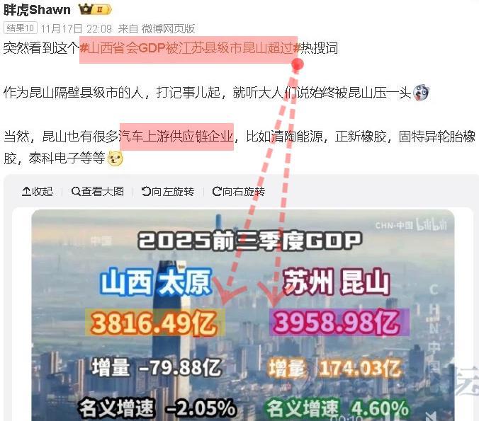 只差一点!昆山三季度破4000!超越省会城市? 有人看到微博上的这个热搜,还挺意外的。三季度的数据发布之后,昆山的体量达到了3959亿。 如果不出意外,明年,昆山将会在三季度末冲破4000亿的大关。而这个数据,今年第一次在三季度,超过了山西的省会,太原。 增速方面,昆山达到了4.6%,而太原是-2.05%,此消彼长之下,这样的结果也在情理之中了。 博主说,昆山有很多汽车上游企业,其实我印象中,昆山最有名的似乎是咖啡,当年曾经开了江苏最早的一批星巴克。 当然,由于位置背靠上海,很多从沪城外延的产业,顺理成章第一选择就是昆山,甚至很多人每天都在上海和昆山之间来回奔走。 太原主要依托能源,在装备制造和钢铁化工等领域形成了巨大的产业优势。似乎现在也在寻求转型了。