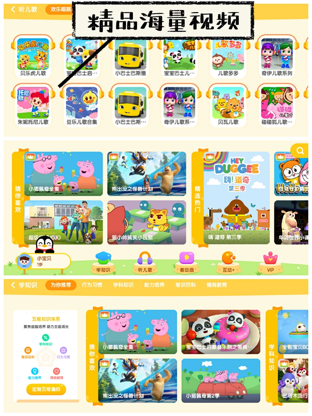 而且它还按照五维知识体系划分了视频,学科以及常识?能力培养?情商?习惯培养?全都有哦,还可以设置偏好,孩子看视频的过程中可以学习到各种基础知识和生活知识,培养创新思维能力锻炼动手能力,养成好的生活习惯,成为人人称赞的乖宝宝噢~难怪宝宝百看不腻,天天喊着企鹅🐧企鹅🐧呢~
