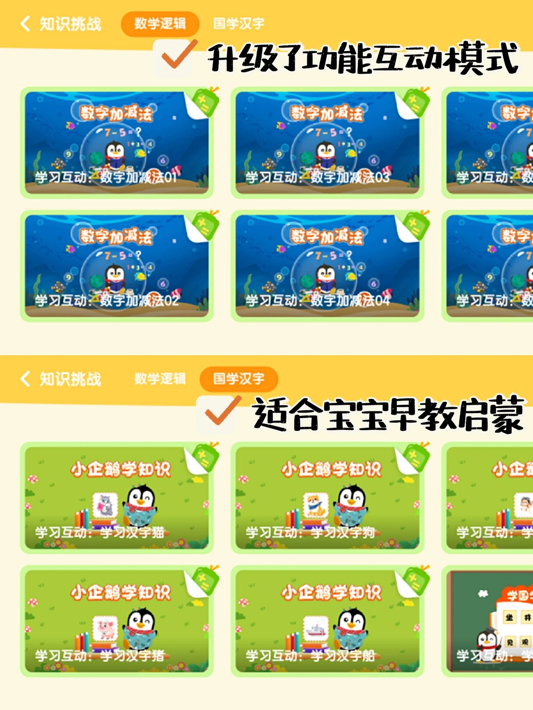 小企鹅app里的交互式动画超多,不仅可以看动画,还可以和动画里的人物交流互动,寓教于乐,Cyndi超喜欢!😍😍尤其是海豚帮帮号的互动视频,有趣又好玩,还有豆乐和超迷你战士,互动玩耍很受我宝宝喜欢~