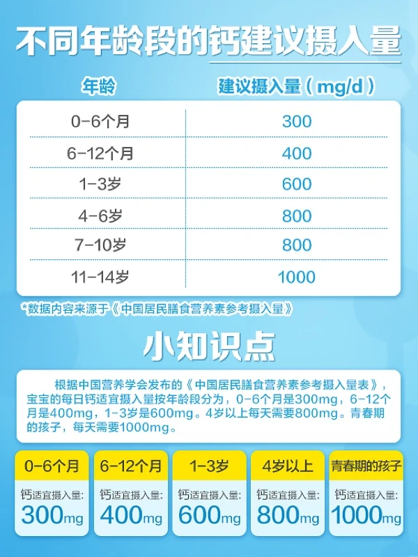 根据中国营养学会发布的《中国居民膳食营养素参考摄入量表》宝宝的每日钙适宜摄入量按年龄段分为, 0-6个月是300mg, 6-12个月是400mg , 1-3岁是600mg, 4岁以上每天需要800mg。青春期的孩子,每天需要1000mg