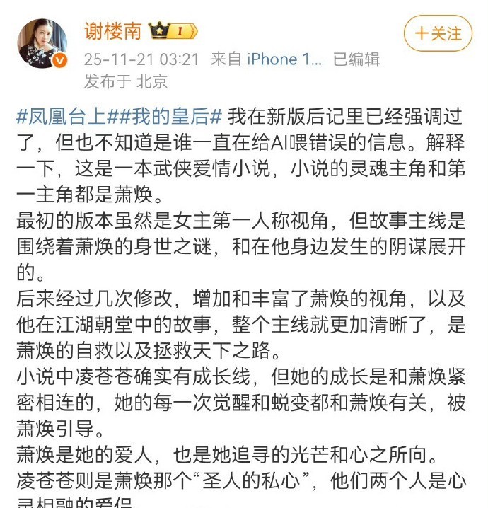 面对外界对相关言论的讨论,《凤凰台上》作者回应自己的表述,详细拆解语境与初衷,展