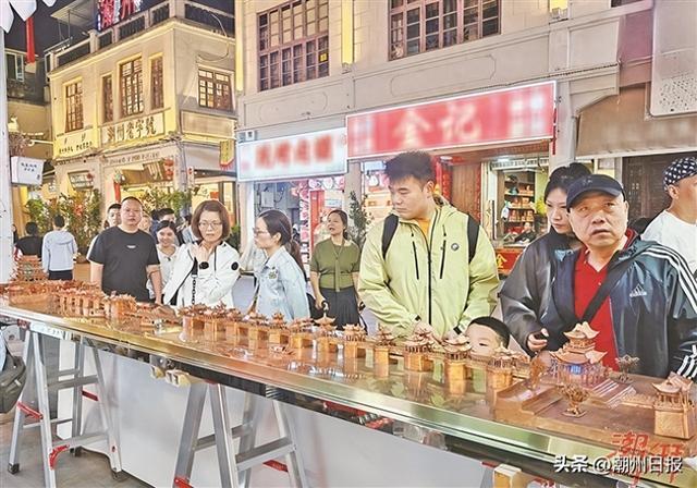 近日,潮州市嵌铜老艺人陈英钦历时三年制作的《紫铜广济桥》在古城区牌坊街亮相,向市民游客展示嵌铜艺术的风采。据作者介绍,该紫铜广济桥耗材120斤纯铜,采用纯手工打造。作品长4米,宽0.5米,仅广济门城楼就用了2000多个铜构件。(王树鹏王永平)