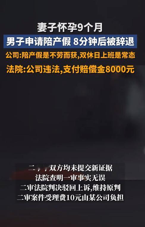 [太阳]11月20日报道,上海男子刚入职15天左右,就以妻子孕37周需要陪护为由,向公司申请10天的陪产假,只过了8分钟,男子就被公司开除,原因是他有一天9点到岗打完卡就消失了,直到中午才回来,属于旷工,男子不服申请仲裁,然而,仲裁只裁决公司支付工资,驳回了赔偿金的请求,男子不服,闹到法院。   (信息来源:光明网——男子申请陪产假,8分钟后被辞退,公司:不劳而获!法院判了)   上海某公司一纸上诉被法院驳回,落得个“违法解除劳动合同”的定论,不仅要支付8000 元赔偿金,还要支付10 元诉讼费。   这场闹得沸沸扬扬的劳动纠纷,源头竟只是员工申请陪产假。谁也想不到一份看似常规的休假申请,会牵扯出三场博弈,而真相揭开时,人们不得不感叹:职场维权,法律从不会缺席。   故事要从2024 年10 月说起,曹某带着对新生活的憧憬入职上海这家公司做会计,双方约定月工资8000,虽没签书面劳动合同,但曹某干活不含糊,满心期待能在新岗位长久发展。   可他没料到,这份干劲十足的工作,会在一个月后因一场突如其来的 “变故” 戛然而止。   去年11 月1日,曹某9点准时到岗,中途临时离开片刻,中午就及时返回岗位,这样的短暂离岗在工作中本是常事,他压根没放在心上。   之后两天是法定休息日,曹某按规定正常休假,可11月4日一早,一场风波骤然降临。考虑到妻子已怀孕37周,随时可能生产,急需家人陪护,曹某向公司提交10天陪产假的申请。   这项权益本就是符合条件的合法待遇,他原以为会顺利获批。可申请刚提交,公司当场拒绝,离谱的是,仅仅8分钟后,公司就抛出一份解除劳动关系的通知,理由竟是他几天前旷工。   曹某又气又委屈,次日特意补交了书面假条,试图挽回局面,可公司不仅不认可,还再次明确告知他已经被解雇,丝毫没有回旋余地。   为了讨回公道,曹某在2024 年 12 月向劳动仲裁机构提交申请,要求公司支付工资,以及违法解除劳动合同的赔偿金。   可2025 年 1 月,仲裁结果出炉:公司需支付10月工资4781.61元和11月1日工资59元,但驳回了其他请求。   这样的结果让曹某无法接受,他果断向法院提起诉讼,而公司方面则按仲裁裁决履行了付款义务,却始终不承认自己的解约行为存在问题。   一审法院的审理让事情的真相逐渐清晰。法官查明,曹某11月1日有明确的到岗记录,公司主张的“旷工”根本站不住脚。 即便公司后来补充曹某11月4日也旷工,但解约通知里压根没提这回事,这样的事后找补,自然不被法院认可。   更关键的是,公司用来作为解约依据的员工管理条例,既没能证明是经过职工讨论、协商确定的民主程序制定的,也无法证实已经公示告知过劳动者。   一审法院最终认定公司属于违法解除劳动合同。按相关规定,判决公司支付曹某赔偿金 8000元,同时驳回了曹某的其他诉求。   可公司依旧不服,紧接着提起上诉,还抛出了一系列让人啼笑皆非的理由:一会儿说曹某是 “借陪产不劳而获”,一会儿污蔑他“擅自取走人事资料”当。   二审法院经过审理,确认一审认定的事实完全无误,最终依照相关法律规定,判决驳回上诉、维持原判,还判令二审案件受理费10元由公司承担。   直到这时,这场持续数月的劳动纠纷才算尘埃落定,最初的悬念也彻底揭开:公司之所以执意解约,根本不是因为曹某“旷工”,而是不愿批准合法的陪产假,又想找借口规避赔偿。   可在法律面前,所有的主观臆断和违规操作都不堪一击。公司不仅没占到任何便宜,反而要支付赔偿金和诉讼费,更严重的是丢了企业信誉。   对于劳动者来说,合法权益被侵害时不必害怕退缩,像曹某这样勇敢拿起法律武器维权,才能让自己的合法权益得到切实保障。   毕竟,法律永远是公平公正的,不会让守法者受委屈,更不会纵容任何违法行为。
